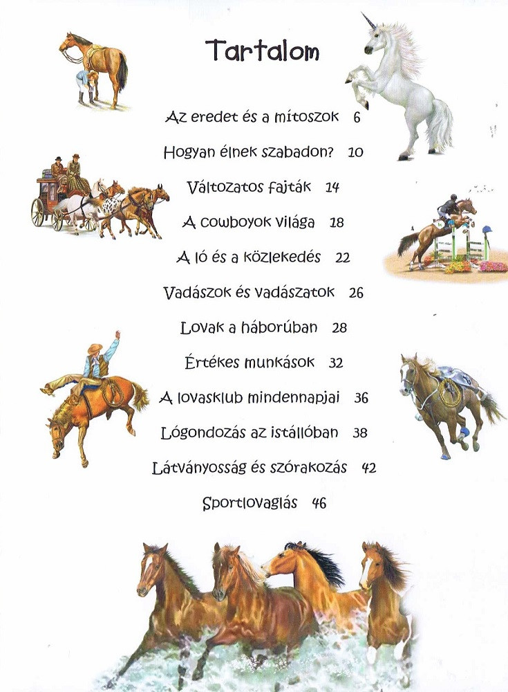 Honnan származnak a lovak? Mekkora volt az őskor lova? Hogyan használták évszázadok alatt az ember egyik leghűségesebb háziállatát? Milyen sportokban versenyeznek? Hogyan gondozzák a lovakat? Ez csak néhány kérdés ebből a könyvből, amelybe rengeteg érdekességet és meglepő tényt gyűjtöttünk össze rengeteg képpel, hogy jobban megismerhesd ezeket a csodálatos állatokat, múltjukat és jelenüket egyaránt.