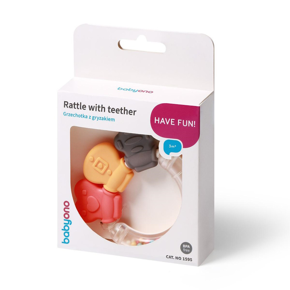 A BabyOno csörgõt és rágókát ötvözõ játéka tökéletes elsõ játék babája számára. Teljesen biztonságos és kellemes tapintású anyagokból készült. A csörgõ praktikus felépítésének köszönhetõen a baba könnyen tudja tartani kis kezében. A csörgõ ideálisnak bizonyul a koordináció és a kézi készségek vicces és biztonságos fejlesztésére. Stimuláló hangok Megrázva a csörgõ finom hangokat ad ki, amelyek felkeltik a baba figyelmét és fejlesztik hallását. Motoros készségek fejlesztése A csörgõ praktikus felépítésének köszönhetõen a baba könnyedén tudja a kis kezében tartani. A rázás hozzájárul a csecsemõk motoros készségeinek fejlesztéséhez, segíti õket a kéz-szem koordináció és a tárgyak kezelésének serkentésében. Rágóka A kellemes tapintású szilikon rágóka gyengéden dörzsöli a baba ínyét és enyhülést ad a fogzási idõszakban. Ajánlott életkor: 3 hónapos kortól A termék mérete: 8 x 8 cm A csomagolás mérete: 10x14 cm Biztonsági információk: Az elsõ használat elõtt forrázza le a terméket forrásban lévõ vízzel (ne forralja!), majd szárítsa meg. A napi karbantartáshoz meleg vízben, babaszappannal történõ mosást javasoljuk. Mosás után alaposan öblítse le és szárítsa meg. Használat elõtt távolítsa el a játékról az összes csomagolást és rögzítõelemet, amely veszélyes lehet a gyermekre. Minden alkalommal, amikor játékot ad egy gyermeknek, ellenõrizze annak minõségét. Csak egy sértetlen játék garantálja hogy gyermeke biztonságosan tudja használni. Dobja ki a játékot, amint észleli a sérülés elsõ jeleit. A játék felnõtt felügyelete mellett ajánlott. A játék megfelel az EN 71 szabványnak. Javasoljuk, hogy õrizze meg a csomagolást referenciaként. Tartsa a csomagolást gyermekektõl elzárva. A csomagolás és a rögzítõelemek nem játékok, és egészségügyi kockázatot jelenthetnek a gyermek számára. Gyártó: Babyono sp. z o.o. street Kowalewicka 13, 60-002 Poznañ, Polska info@babyono.pl
