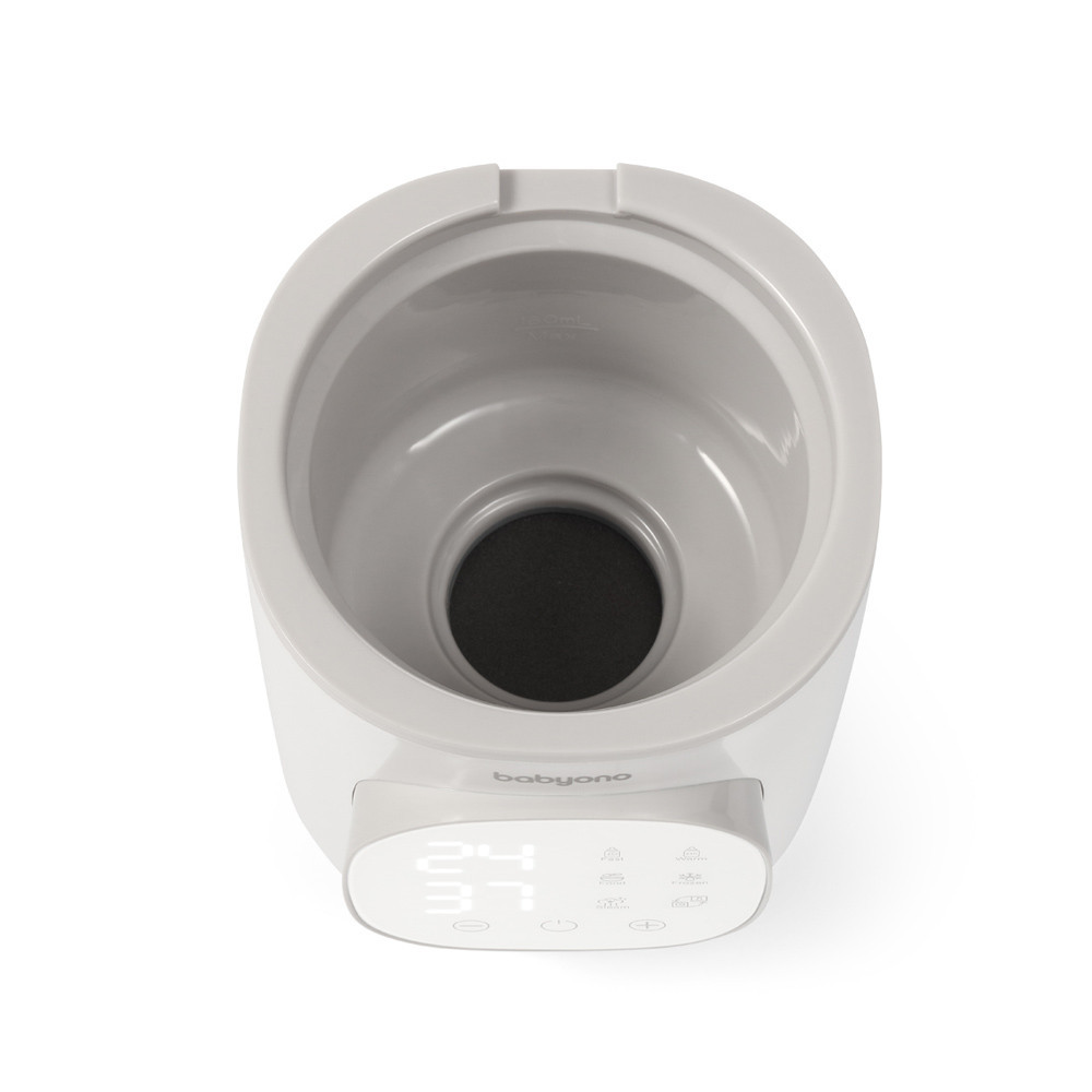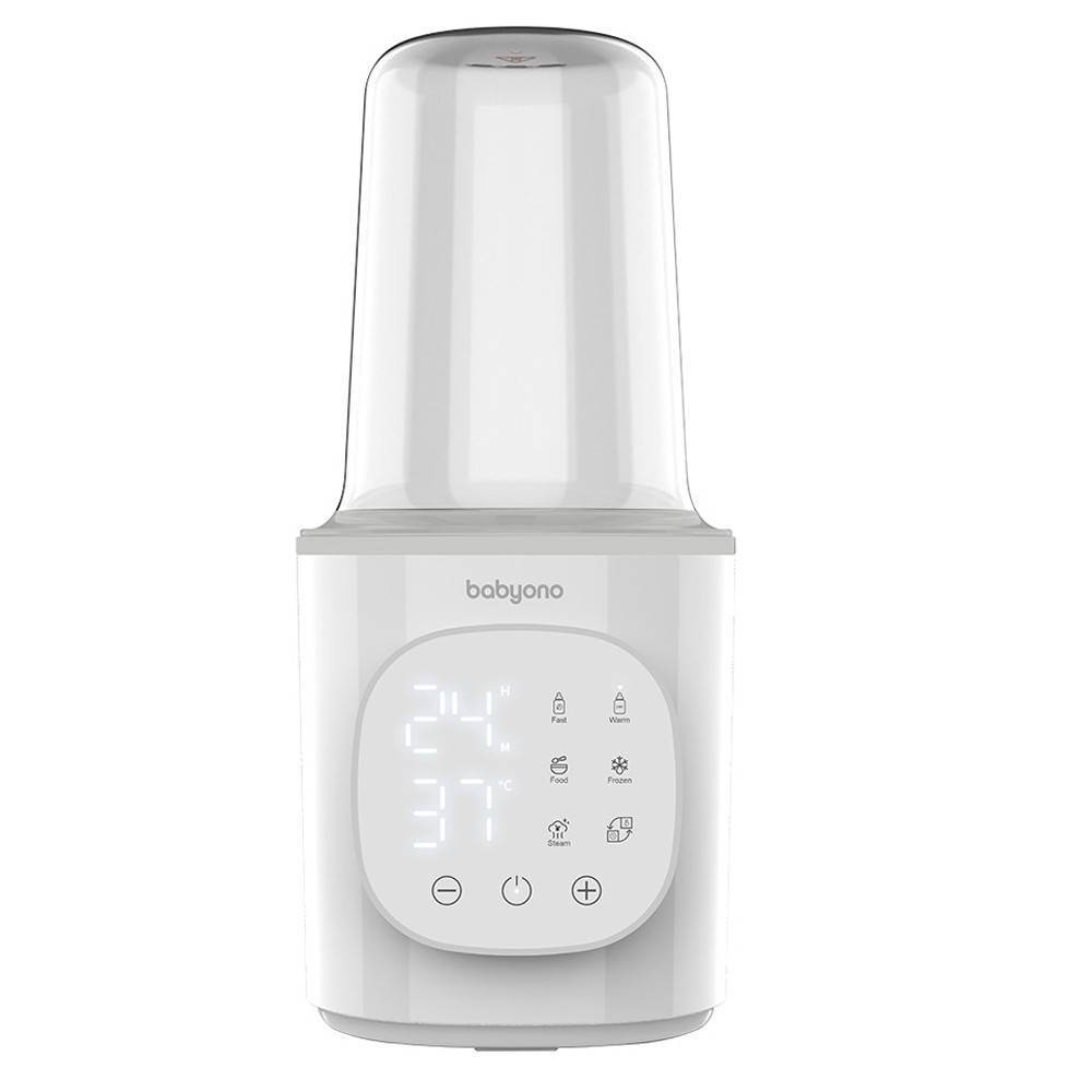A BabyOno elektromos ételmelegítõ és sterilizáló olyan szülõk számára készült, akik értékelik a kényelmet és a termék sokoldalúságát. Ez a termék nem csak a baba ételének a melegítésére szolgál, hanem sterilizálóként is használható. Tulajdonságai: - gyors és pontos fûtés (akár 2,5 perc alatt felmelegítheti az ételt 37°C-ra) - az idõzítõ 0,5 és 12 perc között állítható. Az alapértelmezett hõmérséklet 37 °C. Amikor a kijelzõn az END felirat látható, és a fûtõberendezés sípol, azonnal vegye ki a palackot - a kiválasztott hõmérséklet elérése után a készülék 24 órán keresztül fenntartja a hõmérsékletet - a nagy LED kijelzõ és az intuitív érintõpanel megkönnyíti a program kiválasztását és a hõmérséklet beállítását - a fûtõberendezés beépített termosztáttal rendelkezik, így nem lépi túl a beállított hõmérsékletet. A tej melegítésének alapértelmezett hõmérséklete 37 °C. - a hõmérséklet-tartomány 25 és 100 °C között állítható - a legtöbb cumisüveggel és edénnyel kompatibilis - egy speciális rendszer védi a készüléket a túlmelegedés ellen - a fûtõelem automatikusan kikapcsol, miután a víz elpárolog - hatékonyan sterilizálhatja a cumisüvegeket, cumitartókat, cumikat és a mellszívó pótalkatrészeit - a készülék megtöltésének megkönnyítése érdekében egy speciális, 80 ml-es vízméréshez szükséges mérõedényt mellékeltünk - tej vagy tejhelyettesítõ keverék melegítésének állítható tartománya: 37–60 °C - bébiételes edény / sûrû étel (pl. babakása) melegítésének tartománya: 45–80 °C Teljesítmény: 200 W
