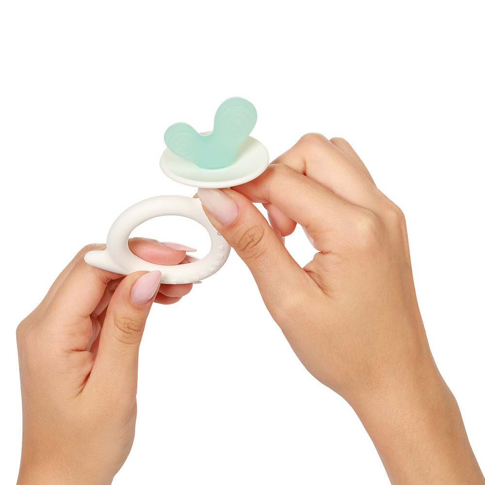 Ennek a rágókának számos tulajdonsága segíti a babát a fogzási idõszakban. Biztonságos anyagokból és ergonomikus formában készült, amely tökéletesen illeszkedik a kis kezekhez. A különbözõ domború részek gyengéden masszírozzák a baba ínyét és segítik a babának felfedezni a szilikon anyag sokrétûségét. A rágóka csökkenti a fogzás közbeni kellemetlen érzést és fájdalmat, mivel finoman masszírozza az irritált pontokat. A rágóka használata segít a babának a finom motorikus készséginek fejlesztésében, illetve stimulálja a tapintás érzékét a különbözõ textúrák és a kellemes tapintású anyagnak köszönhetõen. Tulajdonságok: -Anyag: szilikon -Súly: 29g -Ajánlott életkor: újszülött kortól Méretek: -Termék mérete: 7×10cm -Doboz mérete: 9×15cm