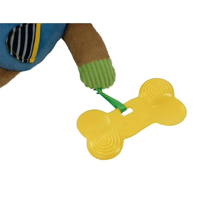 Édes és élénk színű játék a baba számára. Puha és biztonságos barát, tökéletes öleléshez. Aranyos, csontformájú rágókája segít a babának a fogzás során, mert csillapítja az így duzzanatát. A legjobb minőségű, bababarát szövetek, melyek ösztönzik a picit színes és mókás részletekkel a valóság felfedezésében, serkentve ezzel a multiszenzoros fejlődést.