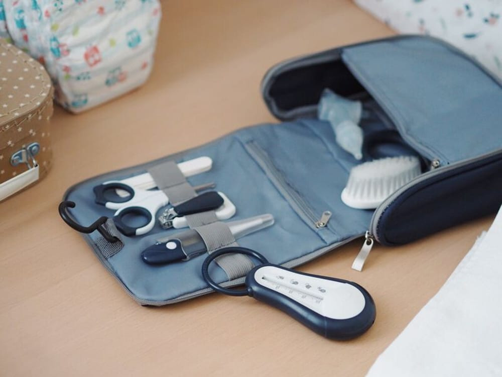 Kilenc alapvető tartozék a baba mosdatásához és ápolásához: fürdőhőmérő, digitális hőmérő, olló, körömvágó olló, hajkefe, rágóka, gumikefe, baba orrszívó, körömreszelő.