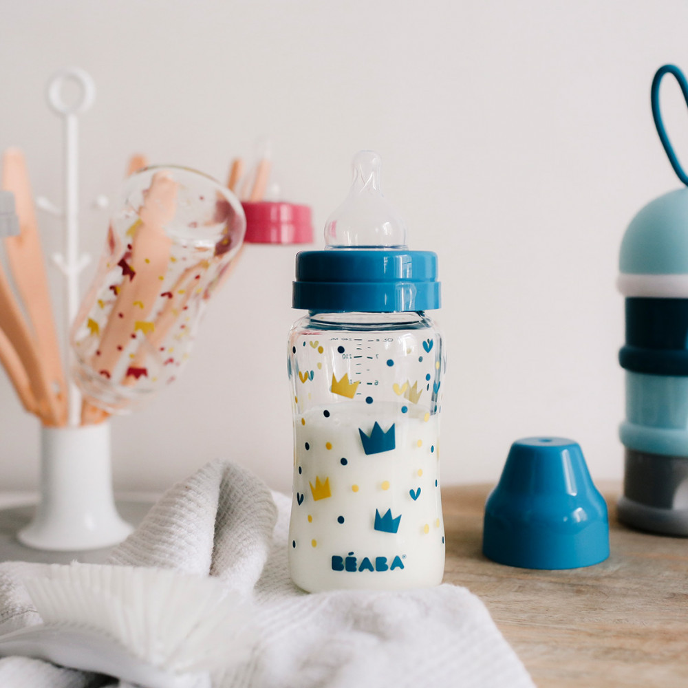 Béaba Szélesnyakú Üveg Cumisüveg 240 ml - Sárga - Kék koronák