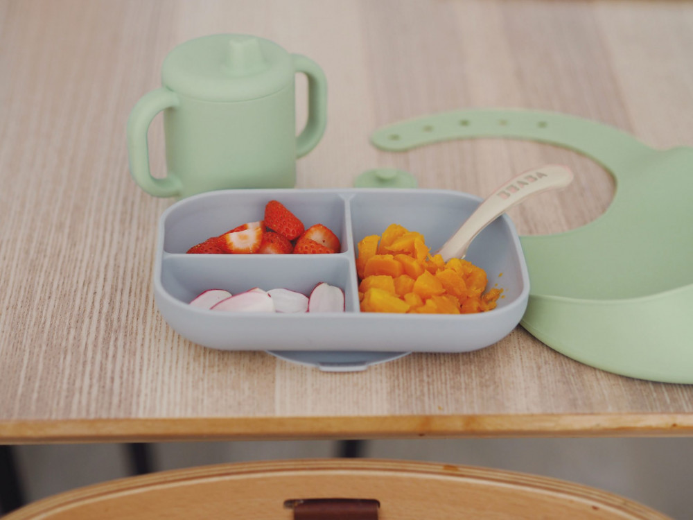 Szilikon tanuló étkészlet, amely egy felosztott tányérból, egy csészéből, egy "2nd age" kanálból áll és egy szilikon előkéből.