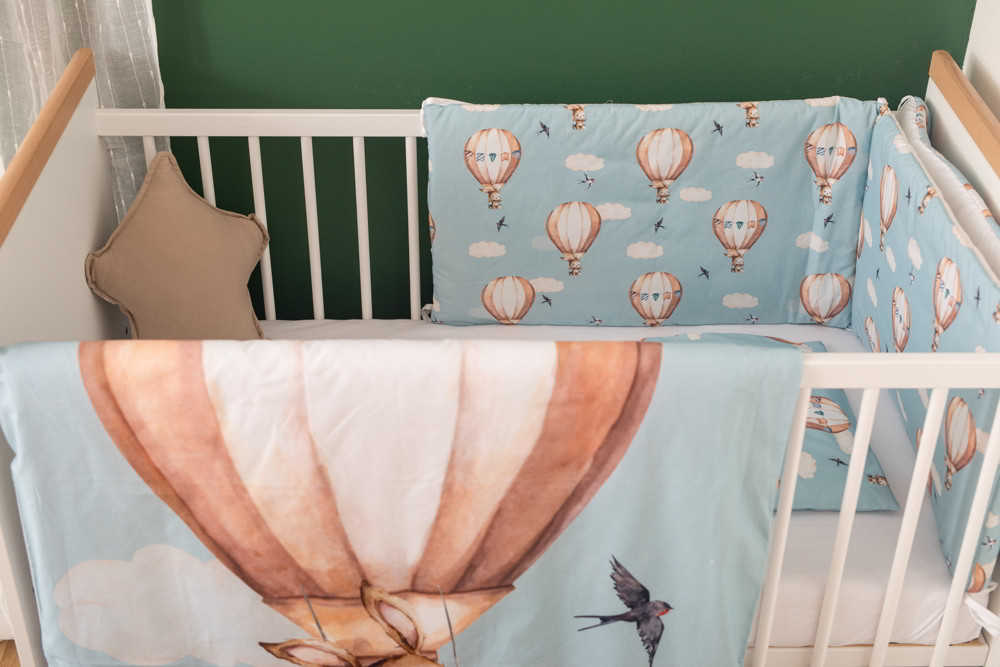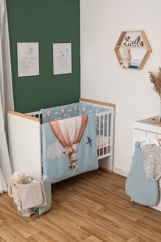 Repülő nyuszi mintával díszített, kék színű Bubaba 6 részes ágynemű szett, mely egy cseppet sem hétköznapi kiegészítője lesz a babaszobának. A szett minden darabja olyan minőségi anyagból készül, amely kényelmes és gyengéd a baba bőréhez, ugyanakkor lehetővé teszi a bőr lélegzését is. A szett tartalmazza a következőket: egy 85x115 cm-es paplant, egy 30x40 cm-es párnát, egy 190x40 cm-es rácsvédőt, egy lepedőt, mely 120x60 és 140x70x10 cm-es matracokhoz is használható, valamint egy 90x120 cm-es paplanhuzatot és egy 30x40 cm-es párnahuzatot. A külső anyag 100% pamut, míg a töltet 100% poliészter. A szett darabjait 30 Celsius fokon, kézzel ajánlott mosni. Az ágynemű garnitúra 120x60 és 140x70 cm-es kiságyakhoz is használható. A gyengéd tapintású, minőségi és kényelmes textiltermékekkel a babánk álmai édesek és nyugodtak lesznek.