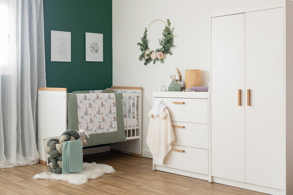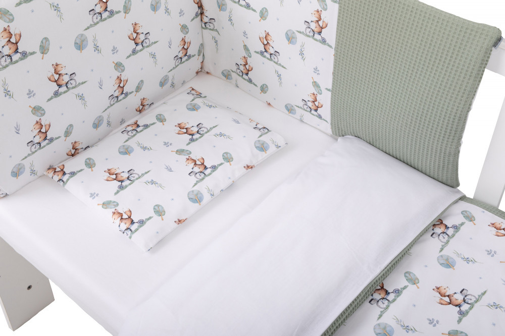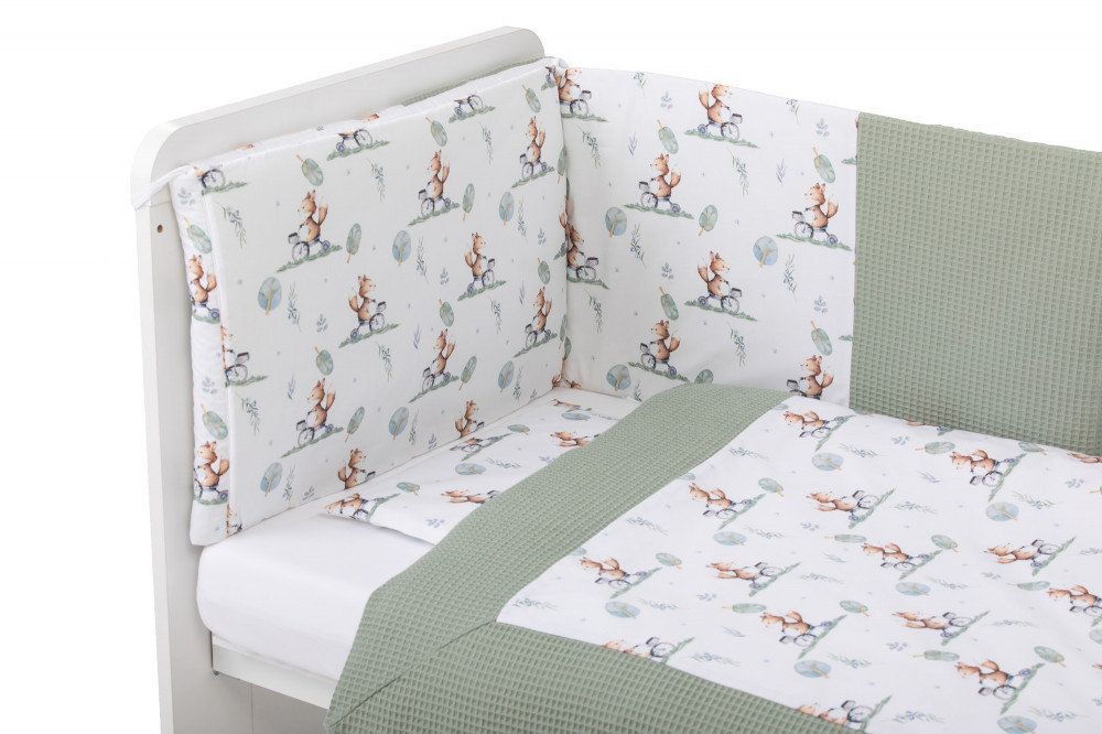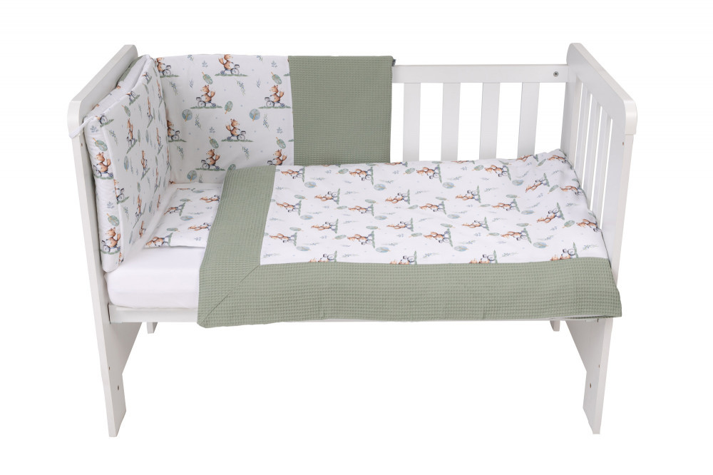 A szett 120x60 és 140x70 cm-es kiságyakhoz is tökéletesen illeszkedik. A garnitúra tartalmaz egy 85 x 115 cm-es paplant, egy 30 x 40 cm-es párnát, egy 40 x 190 cm-es fejvédőt, egy 125 x 60 x 25 cm-es lepedőt, egy 90 x 120 cm-es paplanhuzatot és egy 30 x 40 cm-es párnahuzatot.