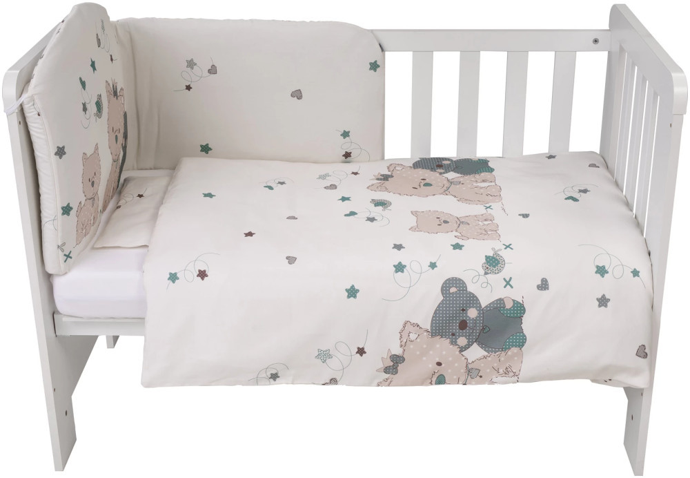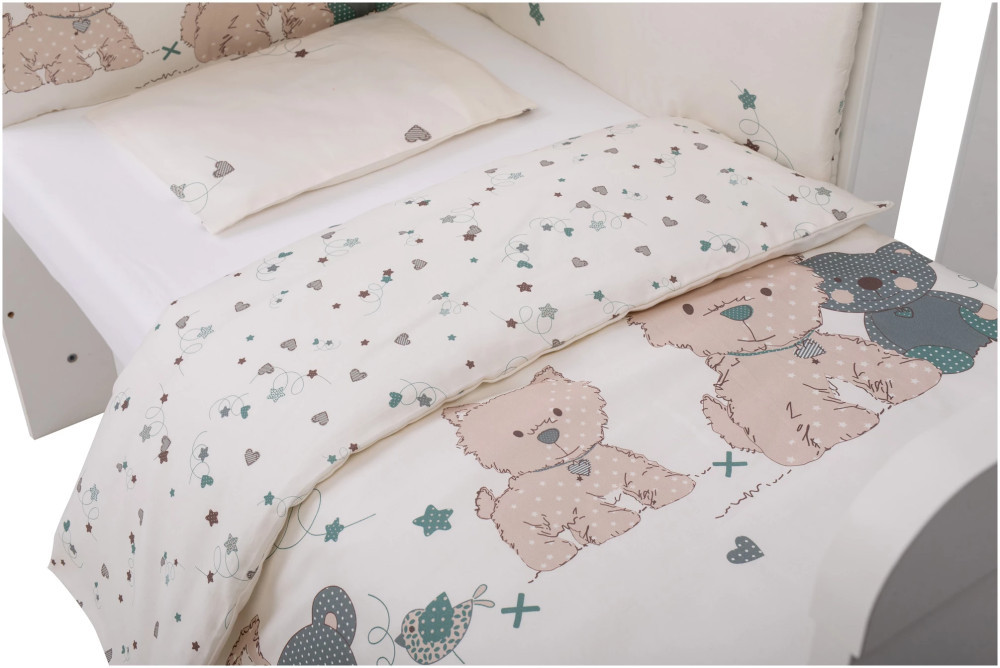 A szett tartalmaz egy 85x115 cm-es paplant, egy 30x40 cm-es párnát, egy 190x40 cm-es rácsvédőt, egy 120x60 x és 140x70x10 cm-es matrachoz való lepedőt, egy 90x120 cm-es paplanhuzatot és egy 30x40 cm-es párnahuzatot. Mindegyik darab 100% pamut külsővel és 100% poliészter töltettel készült, így garantáltan puha és kényelmes lesz a kiságyban.