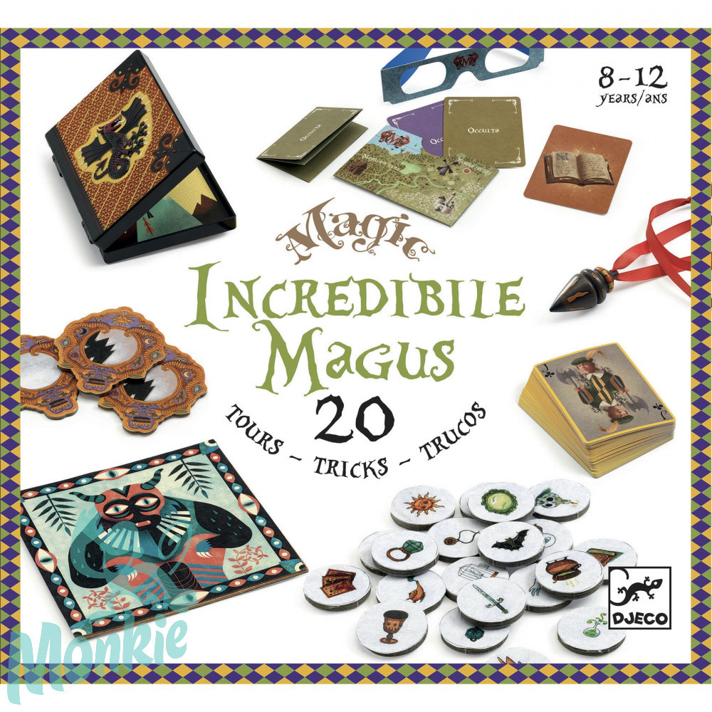 Eltűnés, átalakulás, illúzió és jóslat. A Hihetetlen varázsló egy komplett bűvésztrükk-készlet, hogy a legnagyobb bűvész váljon belőled, már 8 éves kortól remek szórakozás és előgyakorlat a valódi bűvészkedéshez. Doboz 20 bűvésztrükk végrehajtásához elegendő kelléket tartalmaz. Profi bűvészek által kifejlesztett bűvésztrükkök alapján és a Djeco által a gyemekek számra átkomponálva. Fejleszti a készségeket, a logikát, a nyilvános beszédkészséget és az önbizalmat. A dobozban található, világos és pontos magyarázatokat tartalmazó füzet segíti a trükkök elsajátítását.