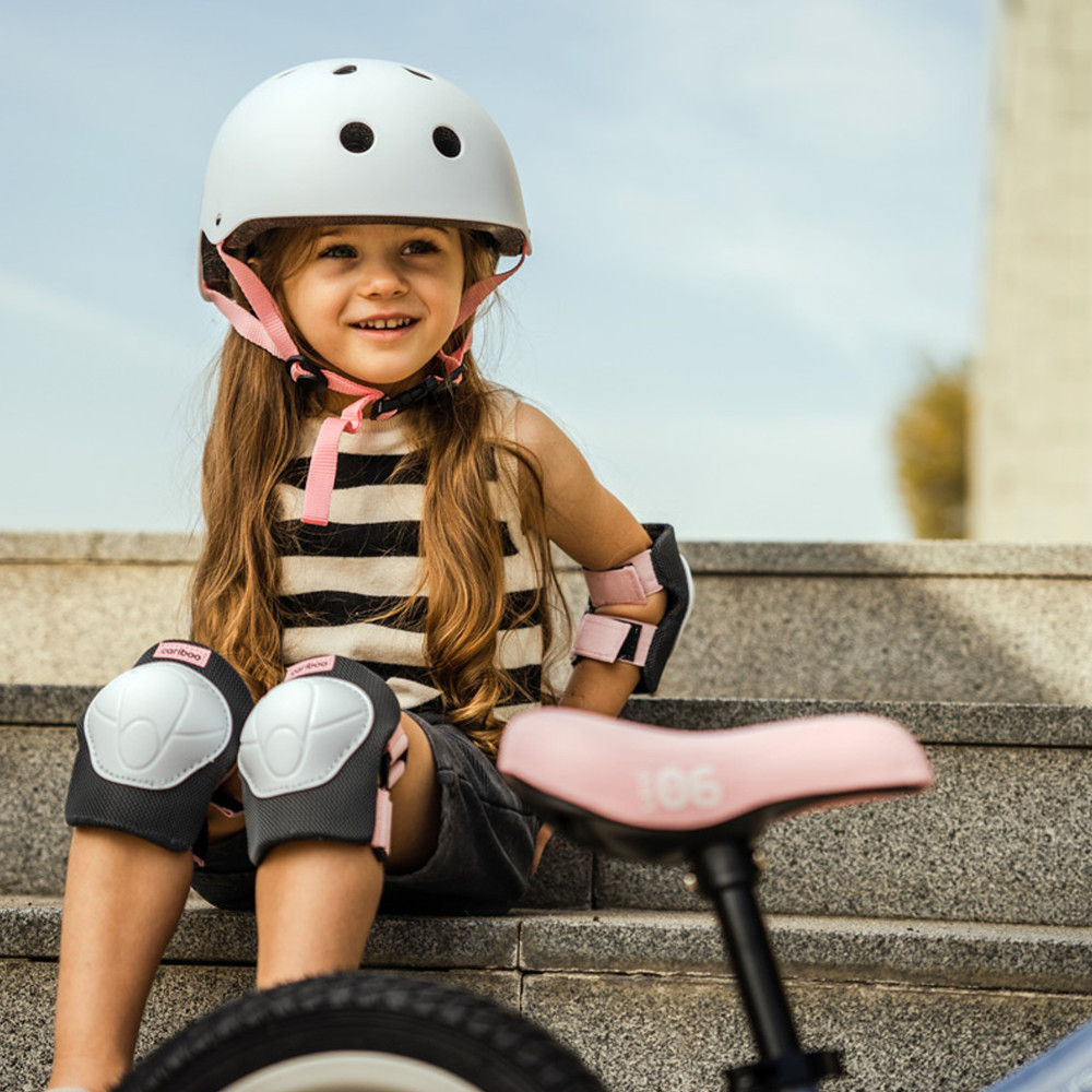 A négyrészes védőkészlet lehetővé teszi, hogy gyermeke a mozgásra összpontosítson anélkül, hogy aggódnia kellene a kidörzsölt, lehorzsolt térd és könyök miatt. A készlet a kerékpáron, kismotoron vagy akár görkorival száguldozó gyermekek számára készült. A beállítás lehetővé teszi a védők tökéletes illeszkedését. Fehér-rózsaszín árnyalatban.