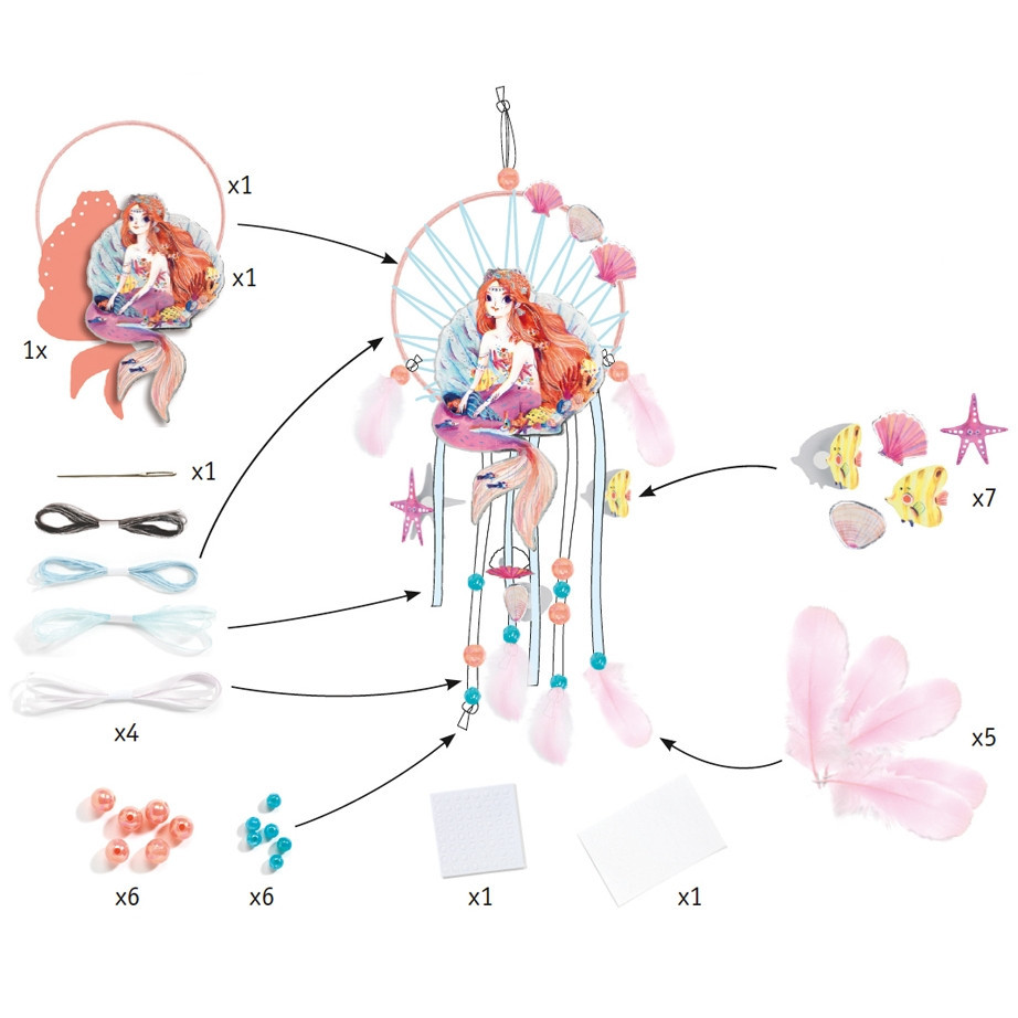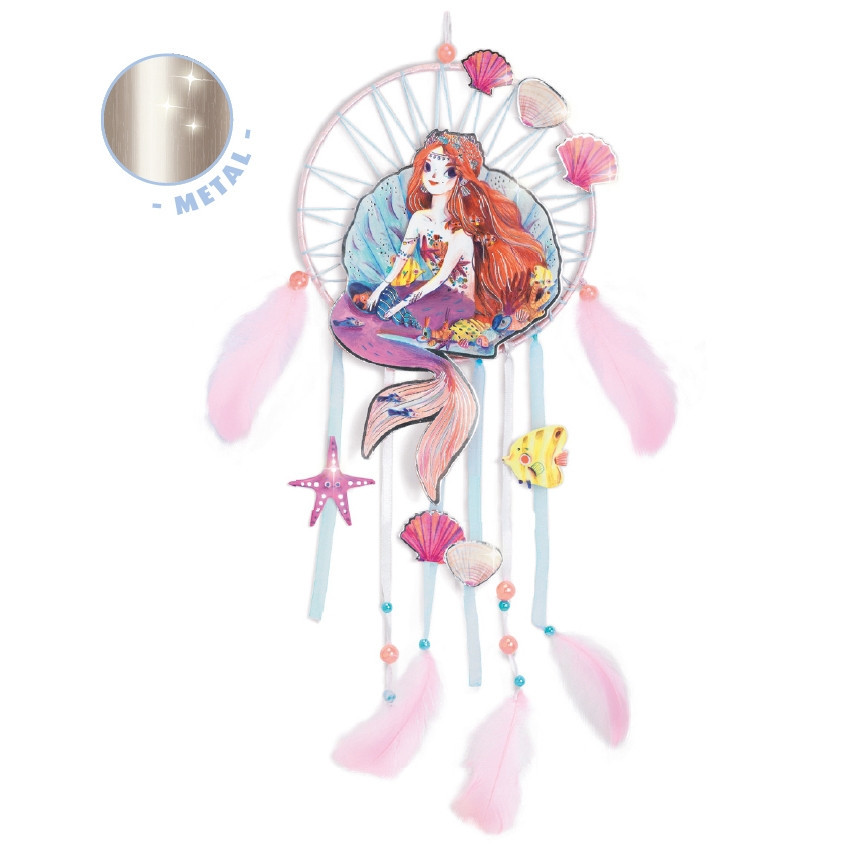 Teljes kreatív készlet egy költői álomfogó készítéséhez a sellő képének színes fonalakkal, gyöngyökkel, szalagokkal és tollakkal való díszítésével. Gyönyörű dekorációs tárgy, amelyet felakaszthatsz a szobádba, hogy távol tartsd a rossz álmokat. Egy takaros dekoratív termék fémes csillogással. A készletben található útmutatóban lévő utasítások lépésről lépésre követhetően végigvezetik a gyermeket az alkotás minden szakaszán.
