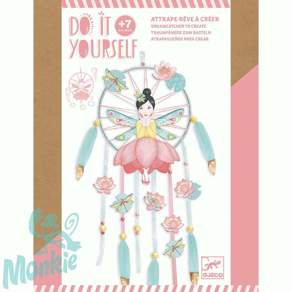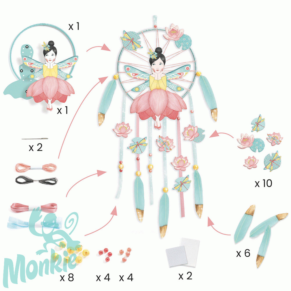 Teljes kreatív készlet egy tündéri, költői álomfogó készítéséhez. A tündér kör hátterű képének színes fonalakkal, gyöngyökkel, szalagokkal, tollakkal való díszítésével lesz készen az álomfogó. Az alkotás megkönnyítése érdekében a kör hátterére már eleve rögzítve vannak a szalagok. A lépésről lépésre követhető útmutatások végigvezetik a gyermeket az alkotás minden szakaszán. Gyönyörű dekorációs tárgy készül, amely felakasztható a szobában, hogy gyönyörködjön benne a gyermek és távol tartsa a tündéri álomfogó a rossz álmokat.