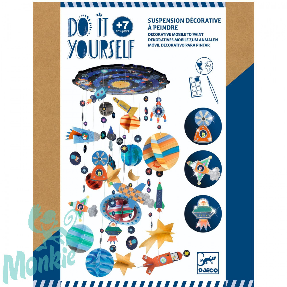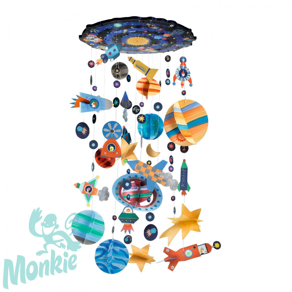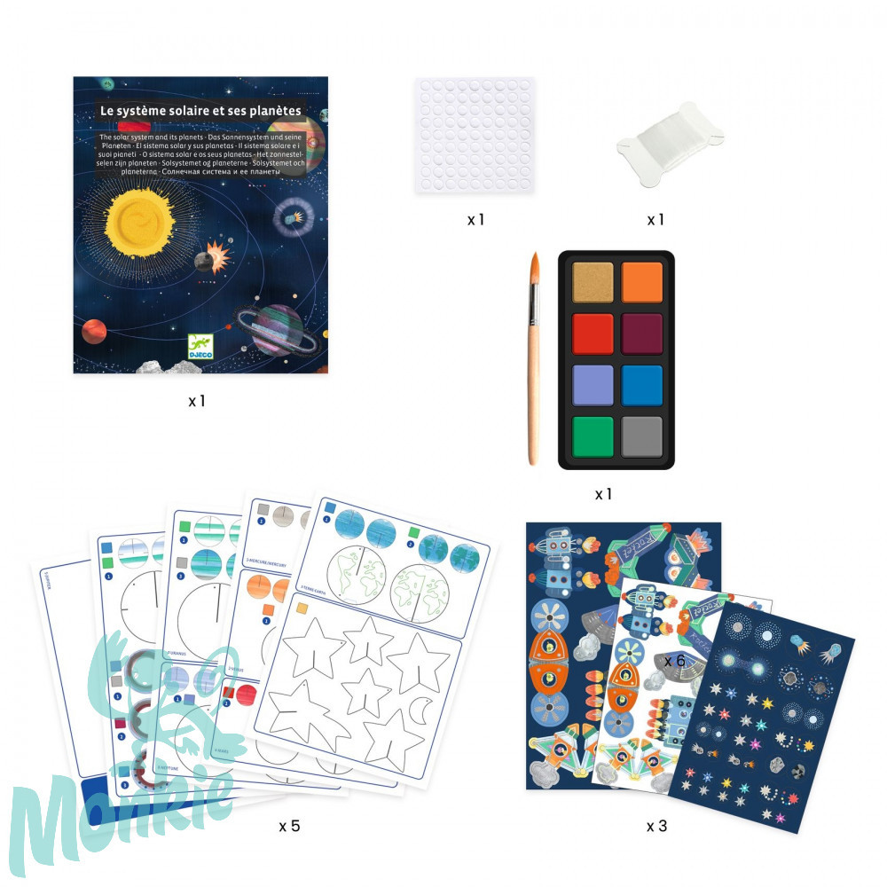 A kreatív műhelyben egy nagyméretű dekoratív függődísz elkészítéséhez minden szükségest tartalmaz ez a készlet. A Naprendszer bolygói kifestésre várnak, és arra, hogy az útmutató füzet irány mutatásai szerint felfűzze a gyermek azokat. Mindeközben sok ismeretet szerezve az univerzumról. A többi díszítőelem (rakéták, üstökösök, csillagok...) hozzáadásával van teljesen kész a fűzés, lehet rögzíteni a füzéreket az előre fúrt alapra.