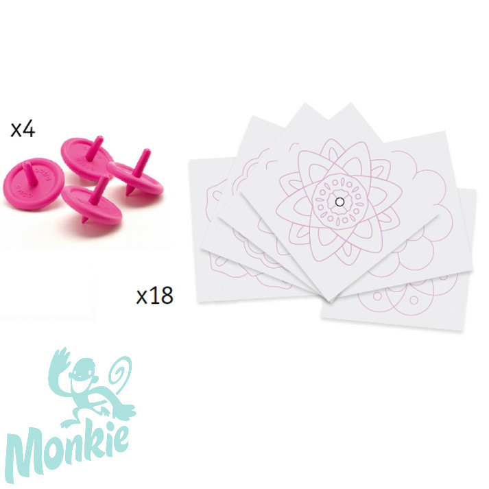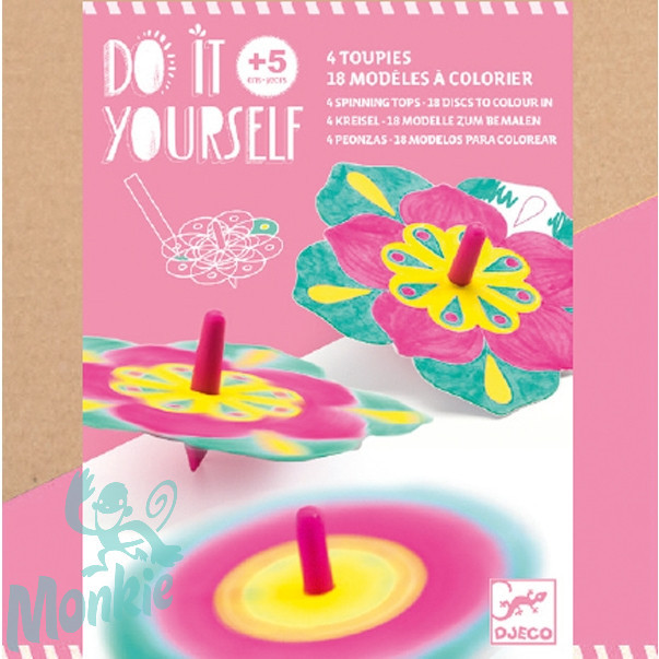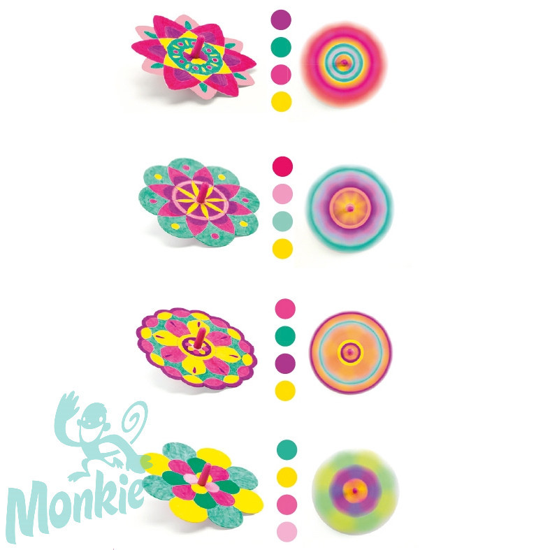 Tartalma: 18 db kiszínezhető pörgettyű alap, 4 db pörgettyű, útmutató.