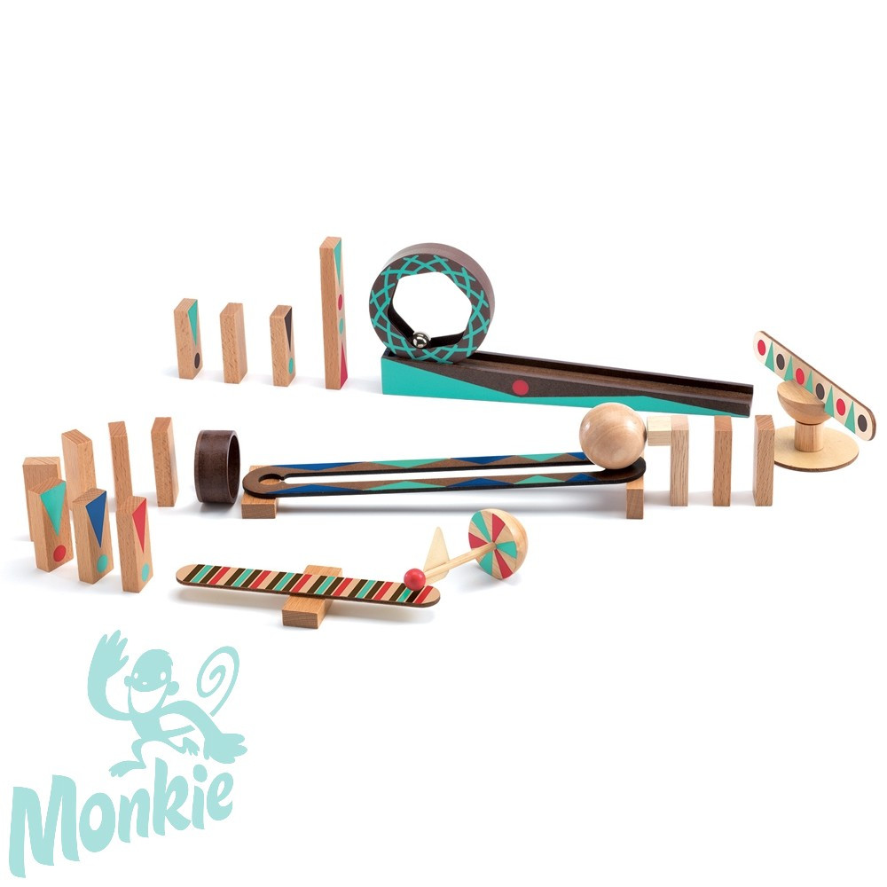 Nagyszerűen megtervezett, komplex gondolkodást, ok- okozati összefüggések felismerését, finommotorikát egyaránt fejlesztő játék. Cél, hogy a gyermekek által előre elképzelt, felépített pályán végig tudjon haladni a golyó, vagy az azt helyettesítő görgős tárgy, eldöntve az útjába kerülő dominókat.