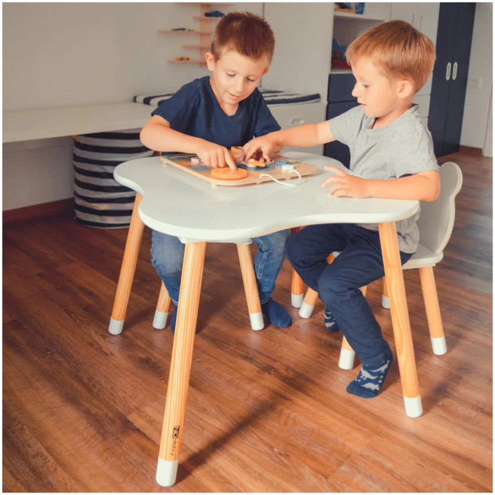 • Minőségi anyagok: Az asztal és a székek stabilak és strapabíróak, a gyermekbiztonsági előírásoknak megfelelően készültek. Az asztal teteje könnyen tisztítható, ami nagyban megkönnyíti a takarítást.