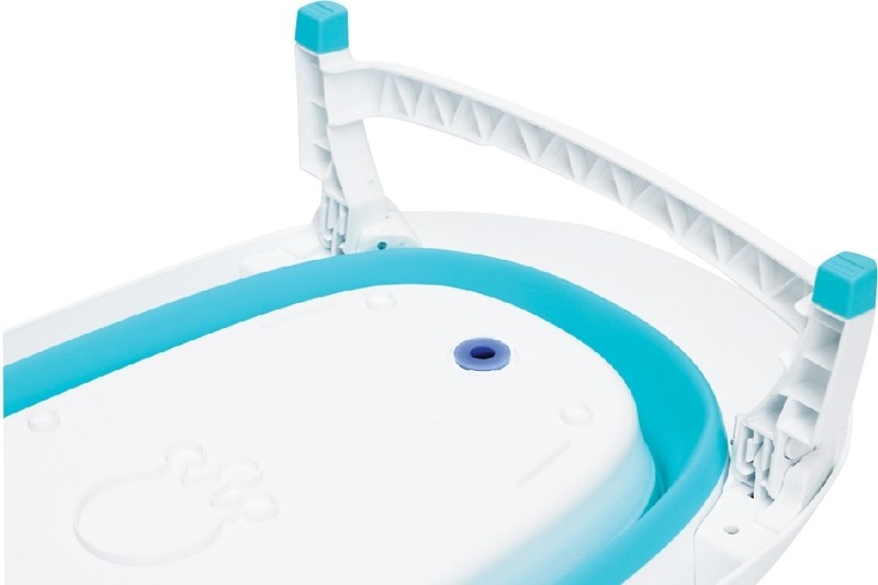 A kád középső részén található menta színű rész puhább anyagból készül, így a kád alját benyomva az harmónikaszerűen csukódik össze. Ezután a lábak is - a rajtuk található gombok benyomásával - becsukhatóak.