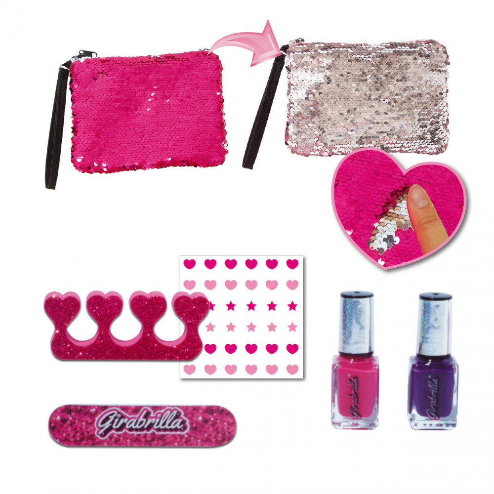 Töltsd fel az inverz flitteres kistáskát a 2 körömlakkal, reszelővel, lábujjelválasztó szivaccsal és körömmatricákkal, és vidd magaddal bárhová is indulsz!