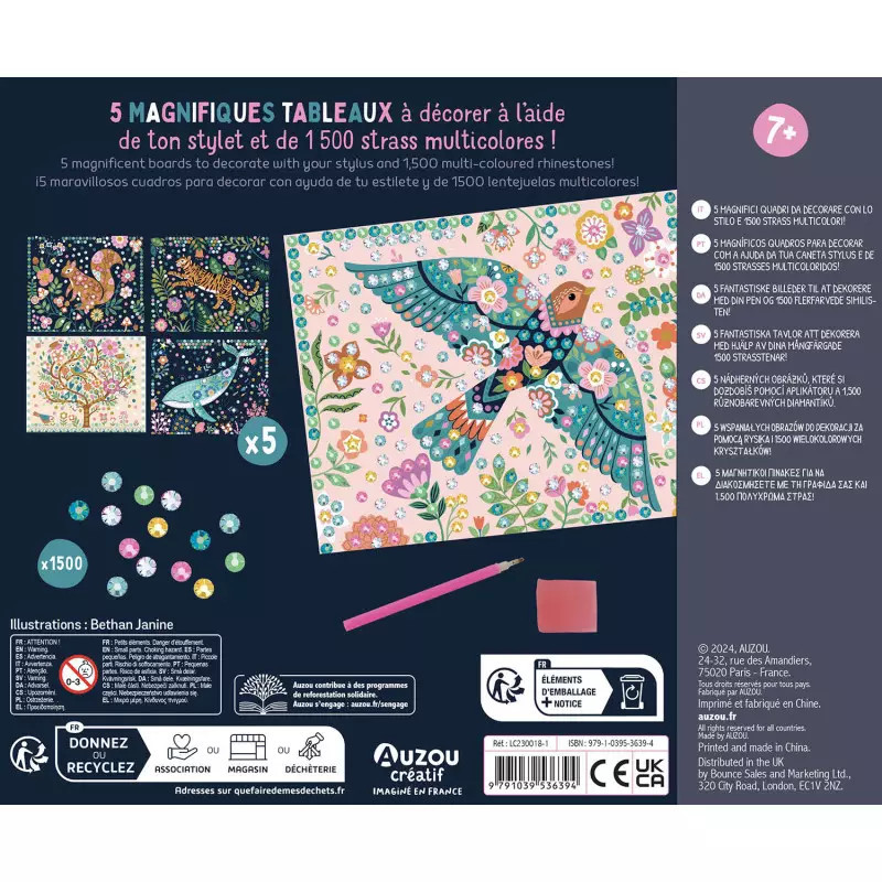 A dobozban 5 db kép díszíthető fel a mellékelt 1500 db strasszkővel. A strasszkövek praktikus visszazárható dobozkákban érkeznek. A kövek felrakását a mellékelt ceruza fogású eszköz segíti. Remek kikapcsolódás és kreatív tevékenység.