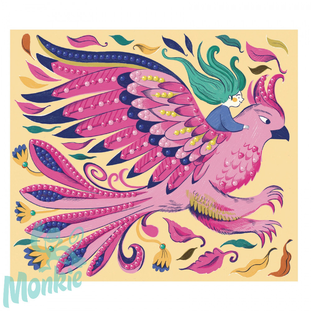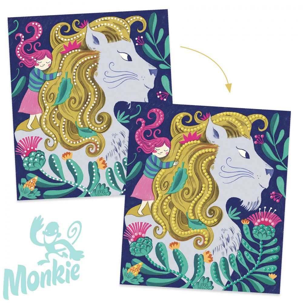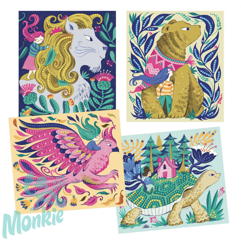 Ebben a készletben 4 illusztrált képet díszíthetsz mini fazettált gyémántszerű strasszok sokaságával. A gyermek a mini strasszköveket a válogatótálcába önti, majd a füzetben található utasításokat követve a tollal megfogja, hogy az előre kijelölt felületekre helyezze azokat. Fokozatosan alakul a kép és a fantasztikus lények a képen domborodnak és ragyognak.