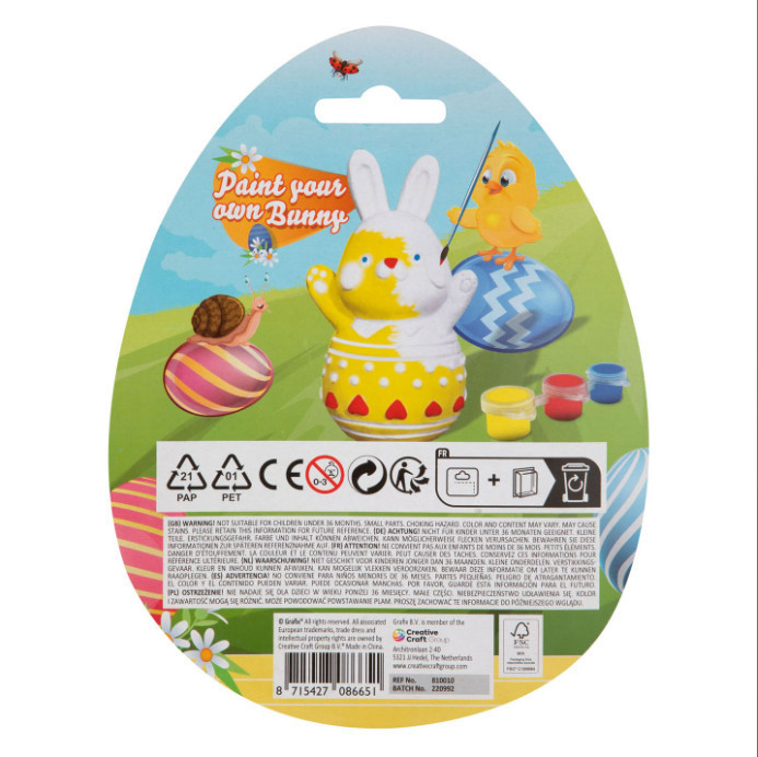 A készlet tartalma: 1 kerámia húsvéti nyuszi, 1 ecset és 3 színű festék. 5 éves kortól.