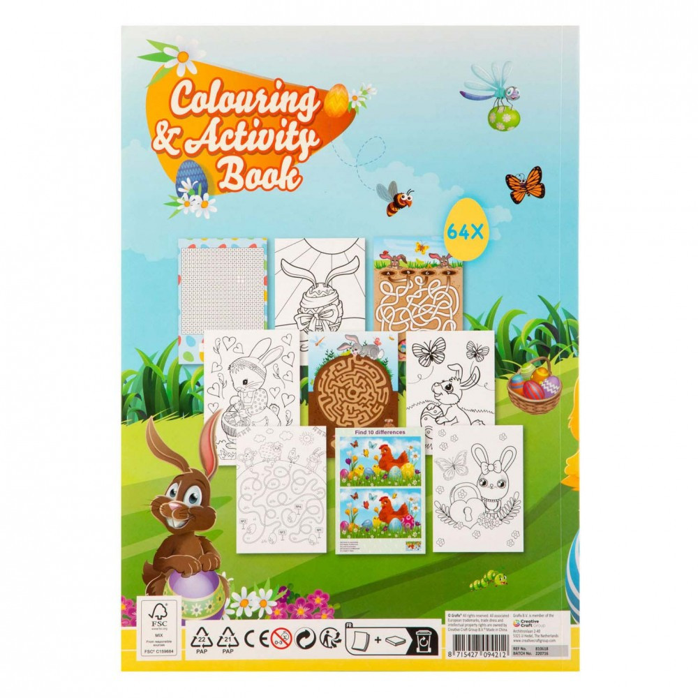 Húsvéti színező- és foglalkoztatókönyv 64 oldallal, mely órákra képes lekötni a kicsik figyelmét. Labirintus rejtvény, színező, szám összekötős rajzolás, különbségkeresés és sok-sok izgalmas feladat, mind a húsvét témakörében.