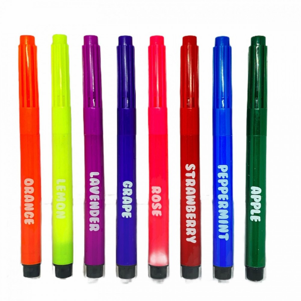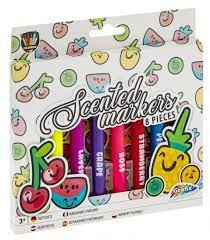 8 db-os filc készlet illatokkal és vastag heggyel a színezéshez. Az élénk színek mellett a 8 filctoll mind más illatú: narancs, citrom, levendula, szőlő, rózsa, eper, menta és alma.