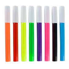 A dobozban kék, fekete, lila, rózsaszín, zöld, sárga, piros és narancssárga színű filctollak találhatók.