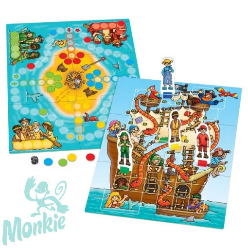 Az Orchard Toys most két jól ismert izgalmas játékot tett egy dobozba. A tábla egyik oldalán a Ki nevet a végén? játékot találjuk, míg a másik oldalon egy kalózos játékot, ahol a létrára vagy kígyóra lépve lecsúszhatunk, vagy feljebb juthatunk a táblán.