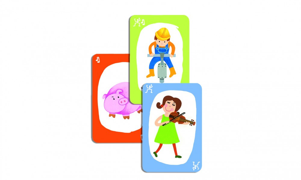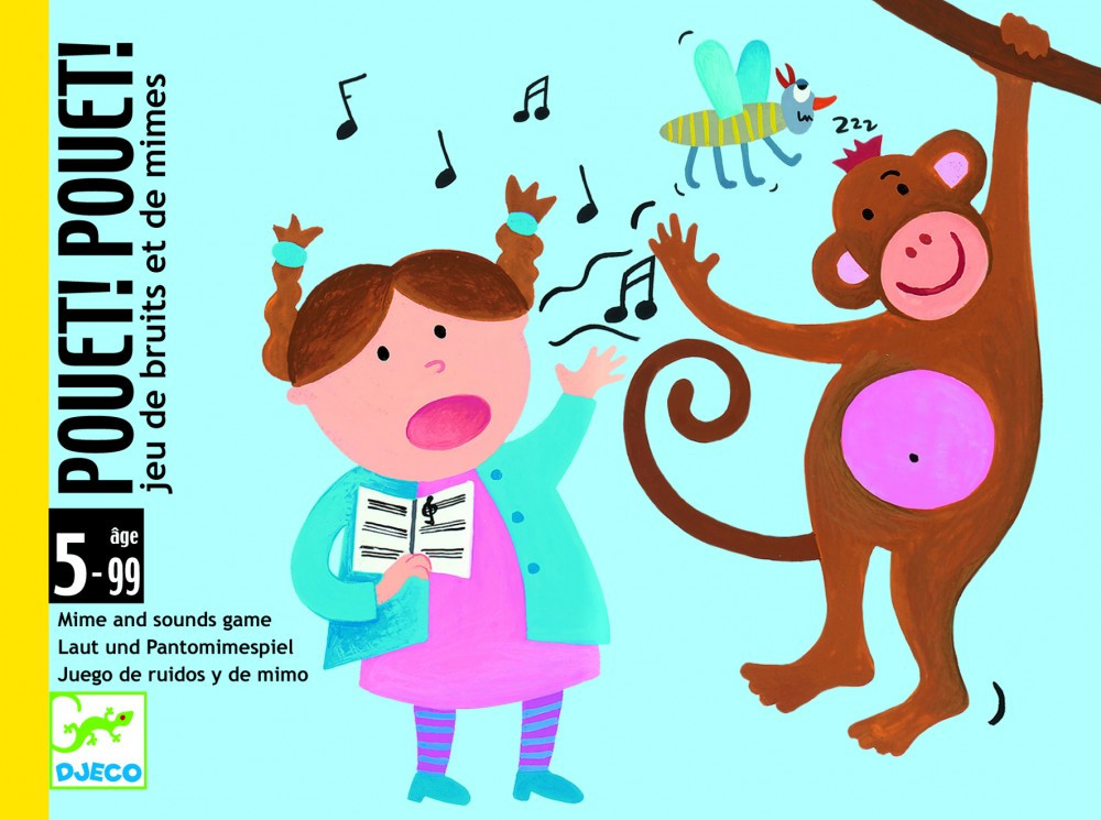 Pouet! Pouet! a Djeco-tól, a jól ismert, hagyományos Activity játék utánzós-mutogatós kártyajáték változata.