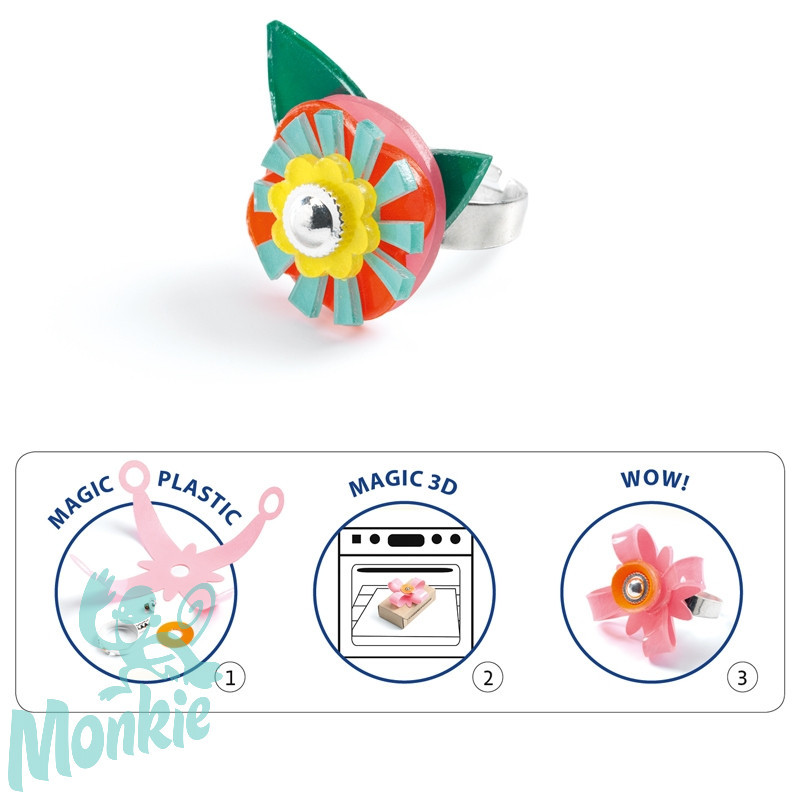 Ezzel a készlettel a gyermek színes zsugorfóliából gyűrűket készíthet! Előre meghatározott alakzatokat vághat ki a mellékelt lapokból, vagy a már kész kis alkatrészeket használja, majd összerakja őket. A sütőben a figurák összezsugorodnak, a műanyag vastag és merev lesz. A kiegészítők készen állnak a legszebb gyűrűk elkészítéséhez!