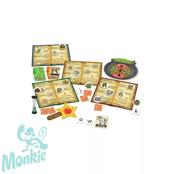 Az Orchard Toys Mágikus helyesírás játékában minden meg van, ami egy boszorkánykonyhához kell: varázskönyv, üst, varázspálca, homokóra, különleges hozzávalók. Ezek segítségével tényleg varázslatos lesz, ahogy egy csapásra megtanulod az angol helyesírást. A játékosok maguk elé teszik varázskönyvüket, választanak egy szókártyát, és mielőtt a homokóra lepereg, igyekeznek a kártyán lévő ábra nevéhez szükséges betűket gyorsan összegyűjteni a varázspálca segítségével, mely láthatóvá teszi a betűket a lefordított kártyákon. Ha sikerül, a szókártya alját megdörzsölve előbukkan a szó és ellenőrizhetik, jól rakták-e össze a betűket.
