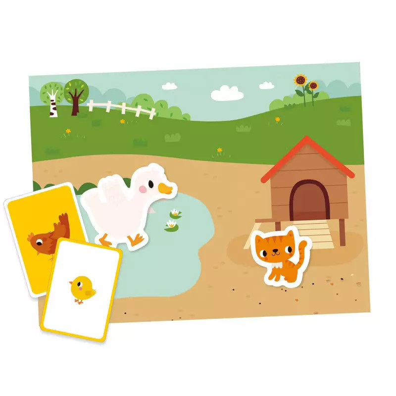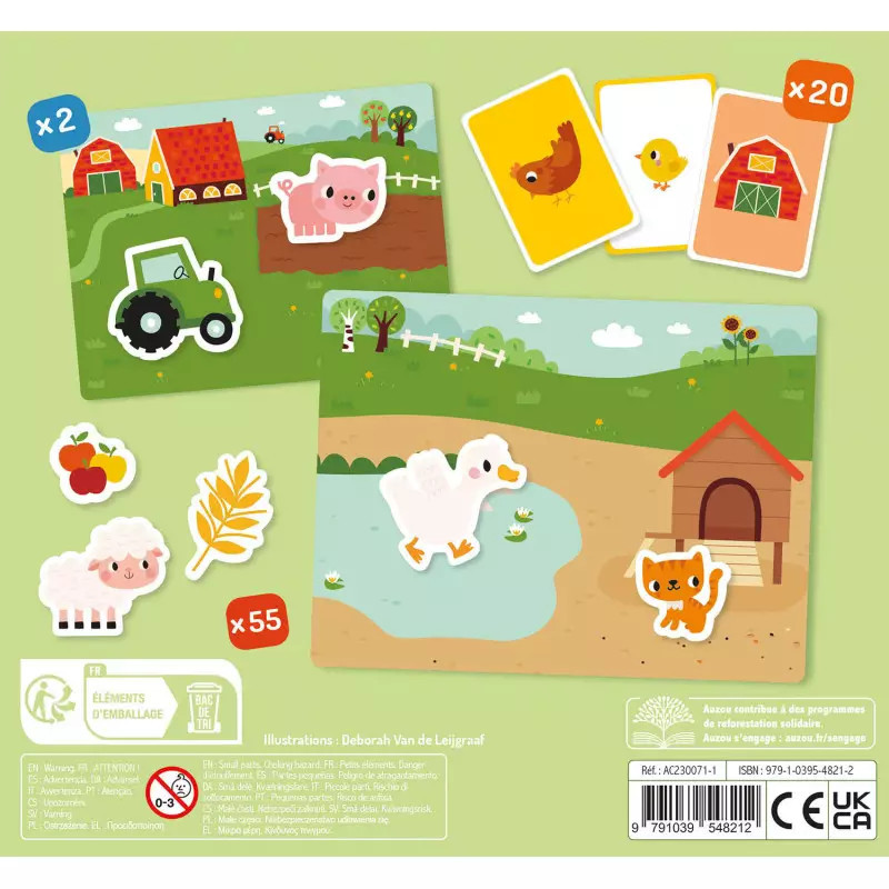 Szórakoztató mágneses doboz a legkisebbek számára a farm felfedezéséhez! A játék 1 kétoldalas mágneses háttér táblát tartalmaz, amelyeket 55 állatos mágnessel lehet kiegészíteni. A 20 db mellékelt kártya lehetővé teszi a gyermekek számára, hogy az állatokat a megfelelő környezetükkel társítsák.