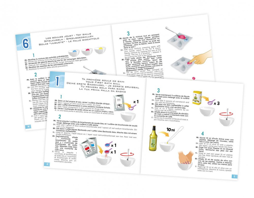 Készíts színes fürdőgolyókat! A golyókat a vízbe helyezve buborékossá és színessé teszik a vizet. A készlettel készíthetsz szivárvány golyót, mini golyót, játék golyót, édes golyót és vulkán kitörést is szimulálhatsz a fürdőkádban.