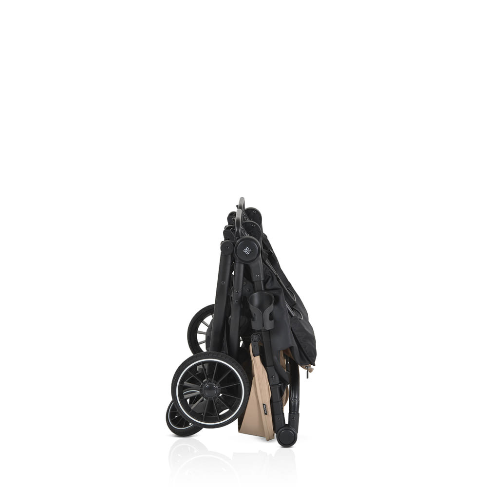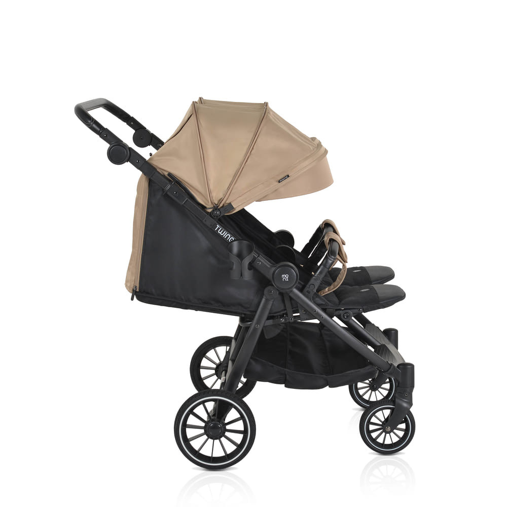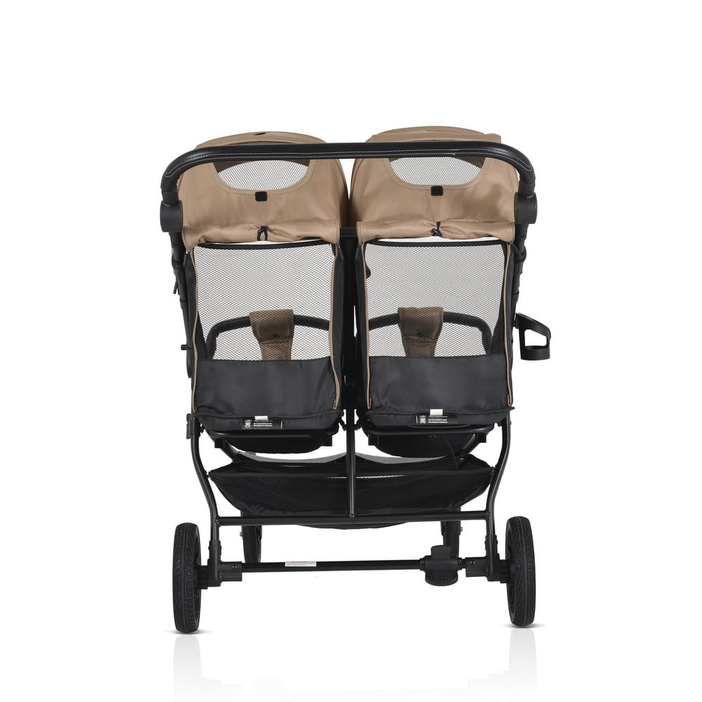 Az iker babakocsi születéstől körülbelül 36 hónapos korig alkalmas, legfeljebb 15 kg súlyú gyermekek számára. Három pozícióban dönthető háttámlával rendelkezik, beleértve a teljesen sík helyzetet, és egy hálós részt a jobb szellőzés érdekében. A kupola állítható, napellenzővel és hálós ablakkal a megfigyeléshez. A fogantyú állítható, öt pozícióban, varrott PU bőrből készült. Az 5 pontos biztonsági öv puha párnázással gondoskodik a biztonságról. A babakocsi első PU kerekekkel van felszerelve, amelyek 360 fokban forognak, reteszelő mechanizmussal és lengéscsillapítókkal minden keréken. A kerekek egy gombnyomással egyszerűen eltávolíthatók. Kompakt és könnyen összecsukható. Levehető PU bőr lökhárító rúd és három pozícióban állítható lábtámasz. A háttámlán tárolózseb áll rendelkezésre a tartozékok számára. A készlet praktikus cipzáras lábvédőt és pohártartót tartalmaz.