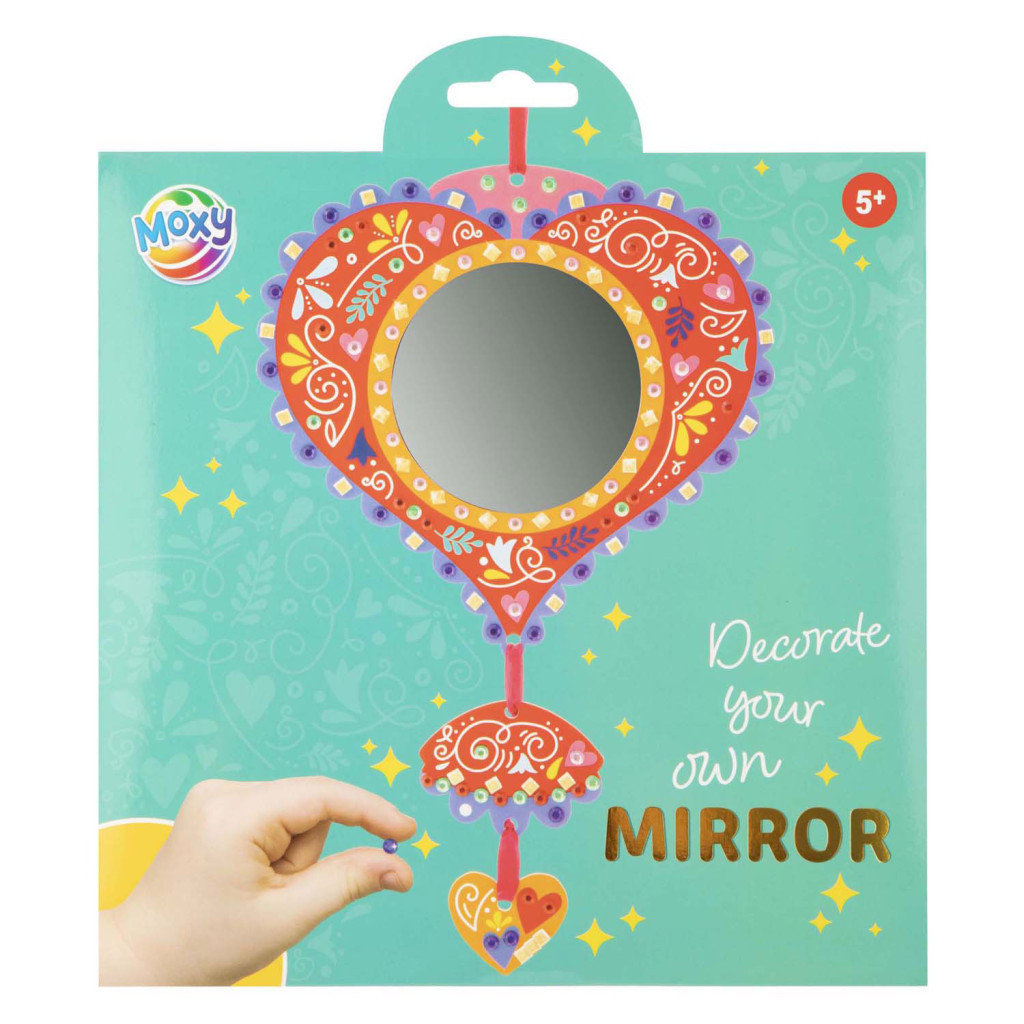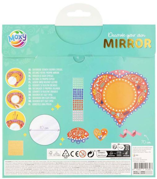 A készletben található egy kidíszíthető karton alap, egy tükör matrica, dekorációs öntapadós strasszkövek és matricák, valamint egy szalag, amivel az egyes részeket egymással összefűzheted és amivel az elkészült munkának akasztót csinálhatsz.