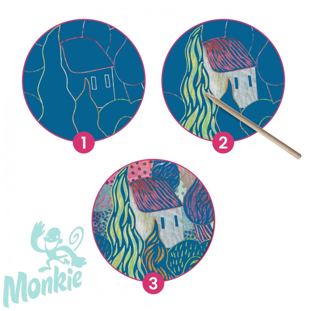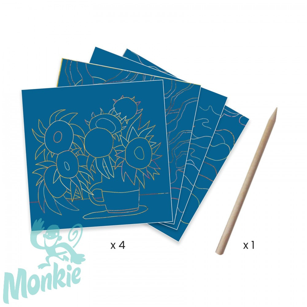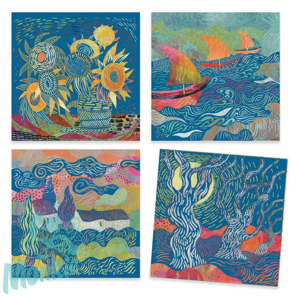 A Délen című karcképek sora arra invitál, hogy felfedezzék a gyermekek Vincent Van Gogh, a háború előtt élt nagy mester stílusát. A fából készült karcceruzával a képek felületét lekarcolják, és ezzel az illusztrátor, Muriel Kebra által elképzelt motívumokat reprodukálják. A festmények így fokozatosan tárulnak fel és a tájak életre kelnek.