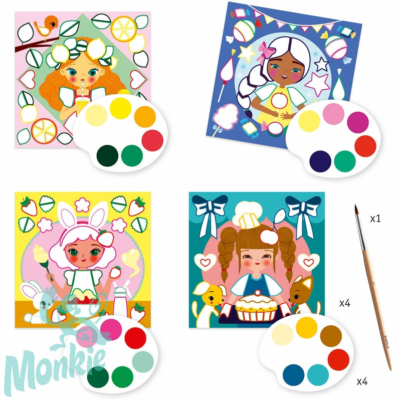 A készlet tartalma: 4 db (20x20 cm) illusztrált kép, 4 db szín-paletta, 1 db ecset.