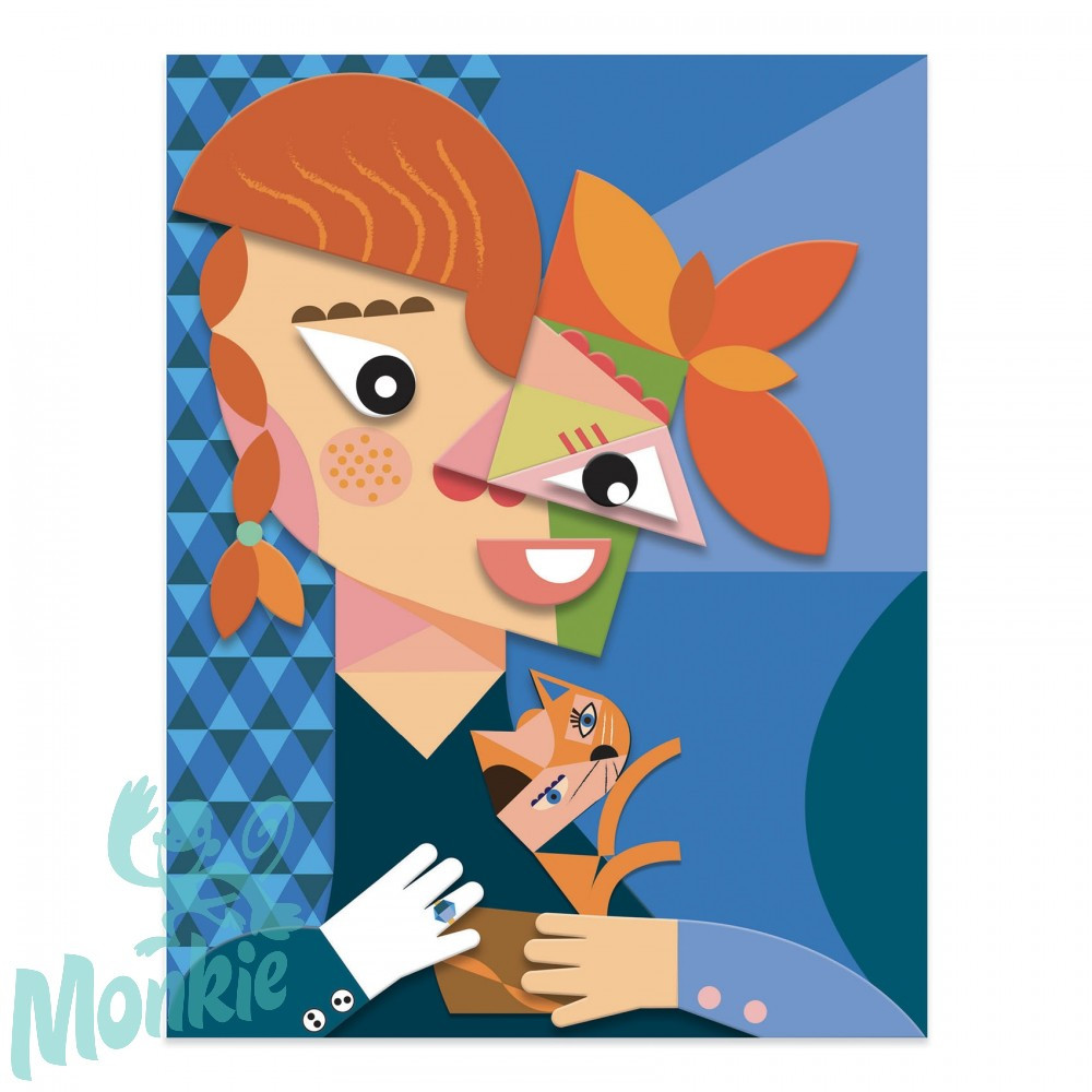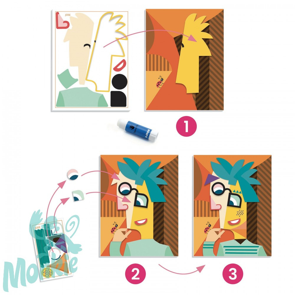 A kollázs-techinikával készülő képek Pablo Picasso, a kubizmus nagy mestere stílusának felfedezésére adnak lehetőséget. A kinyomtatott és perforált kartondarabokat apránként összeillesztik és egymásra helyezik, hogy 4 db különös, érdekes perspektívákkal bíró portrét alkossanak. Nagyon vicces karakterek születnek!
