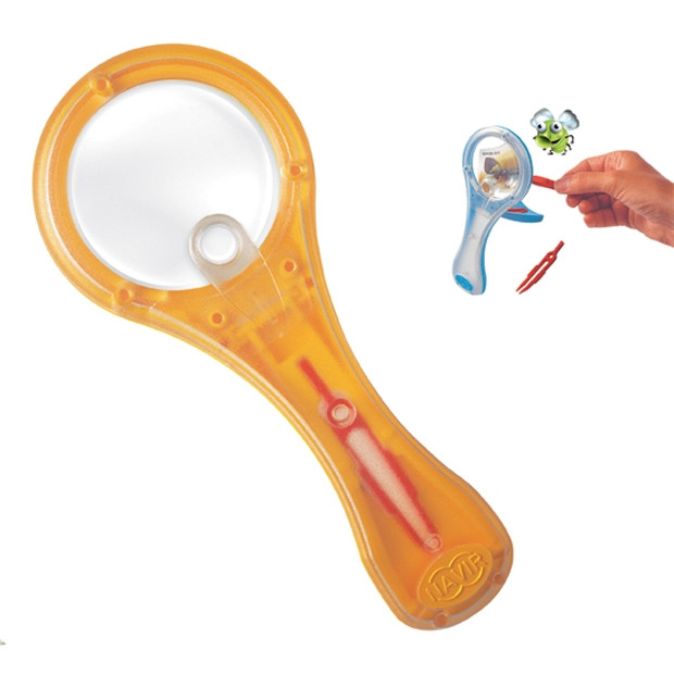 A kétfelé nyitható fogantyúval felállítható nagyító mögött, szabadon használható mindkét kéz. A fogantyúból kivehető csipesz lehetővé teszi az apró tárgyak megfogását, lencse mögötti vizsgálását.
