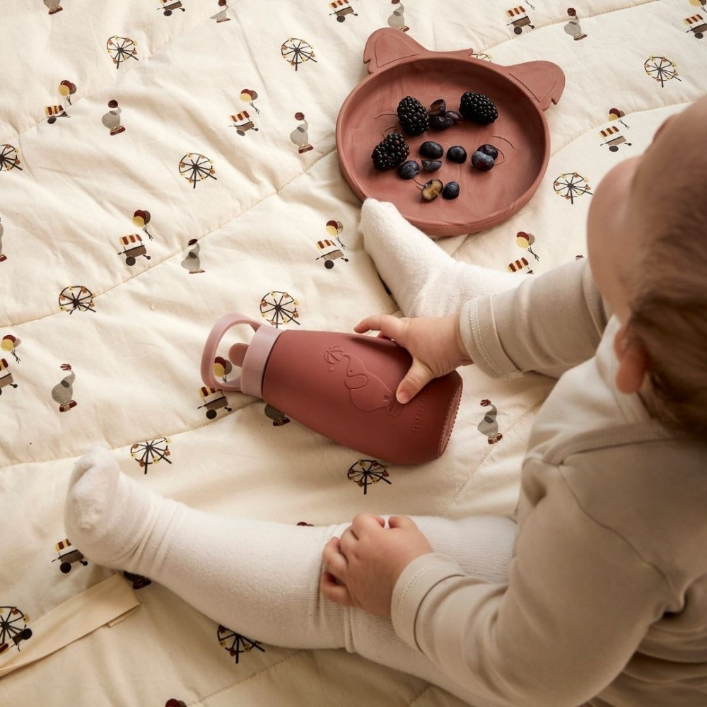 Ivópalack egy cirkuszi elefánt aranyos képével. A palack 100% LFGB szilikonból készül, amely káros vegyi anyagoktól mentes és élelmiszerekhez engedélyezett. A fedél műanyagból készül, és szorosan illeszkedik a palackhoz.