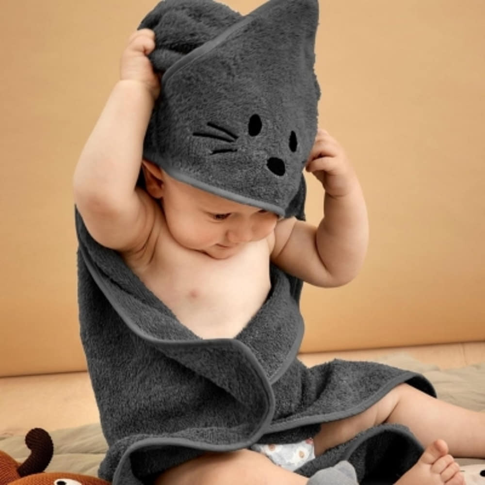 • Kapucnis kialakítás: A praktikus kapucni nem csak aranyos, hanem hasznos is, mivel segít megőrizni a baba testhőjét fürdés után, valamint védi a fejét és a füleit.