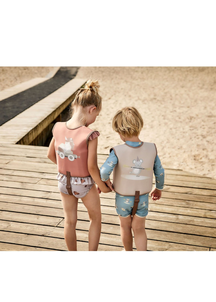 A vízálló anyagból készült mellény állítható pántjai révén tökéletesen illeszkedik, és biztosítja a szabad mozgást. Speciális biztonsági pánttal is rendelkezik, amely megakadályozza, hogy a kicsik kicsússzanak a mellényből.