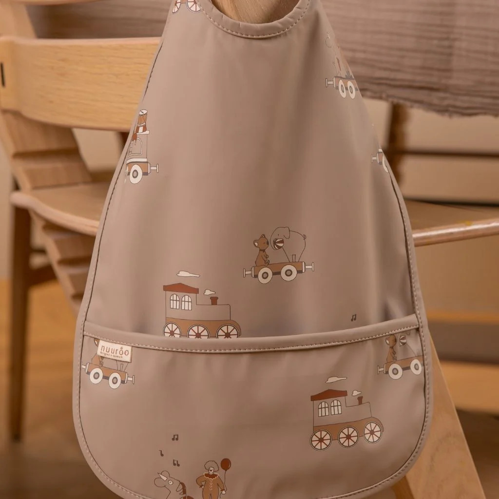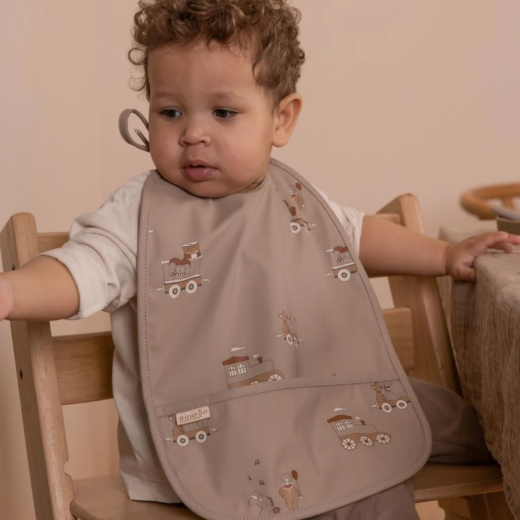 Aranyos és praktikus előke, amelynek elülső zsebe felfogja a folyadékot és a lepotyogó ételt is. .Az újrahasznosított poliészter megkönnyíti az előke nedves ruhával történő tisztítását.