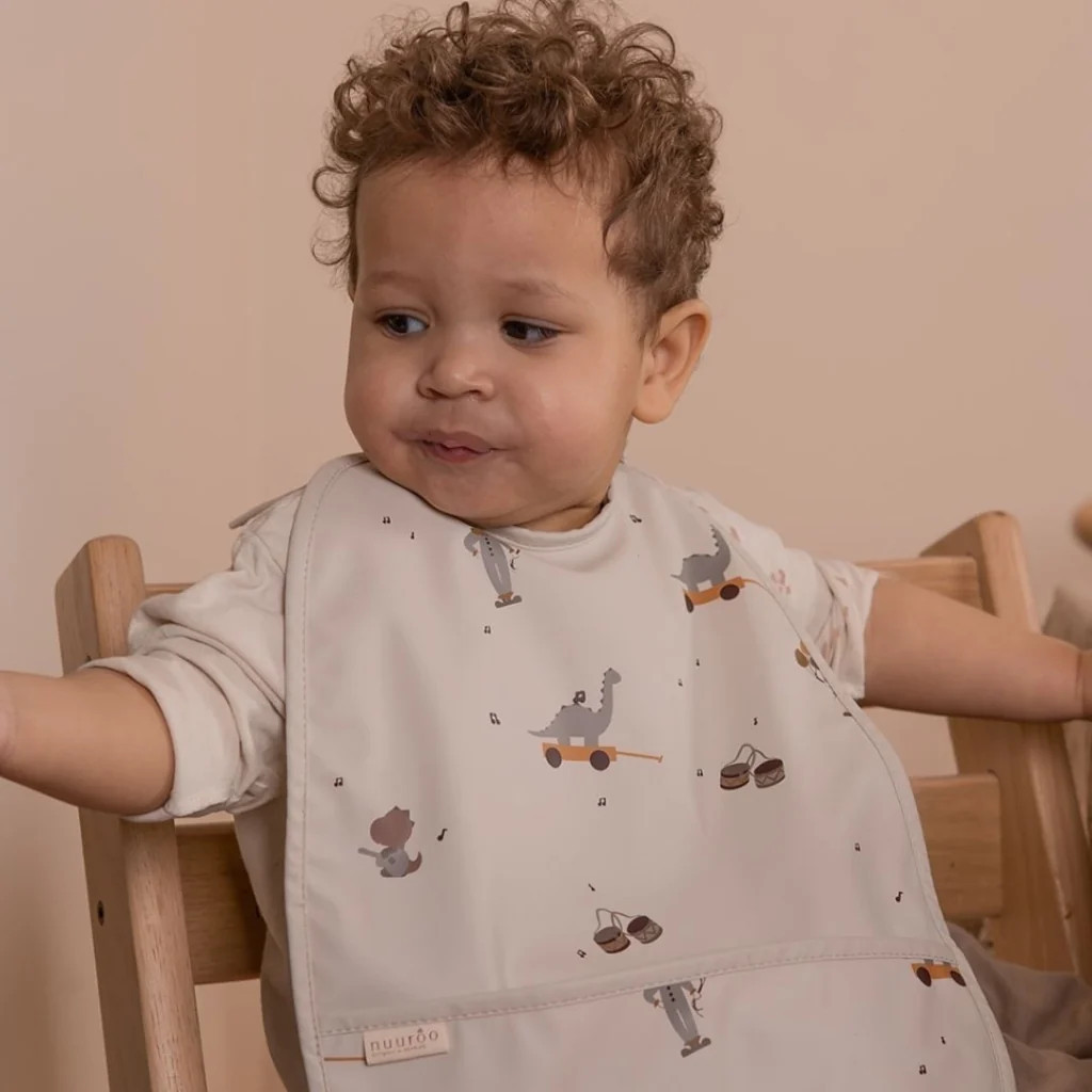 Aranyos és praktikus előke, amelynek elülső zsebe felfogja a folyadékot és a lepotyogó ételt is. .Az újrahasznosított poliészter megkönnyíti az előke nedves ruhával történő tisztítását.