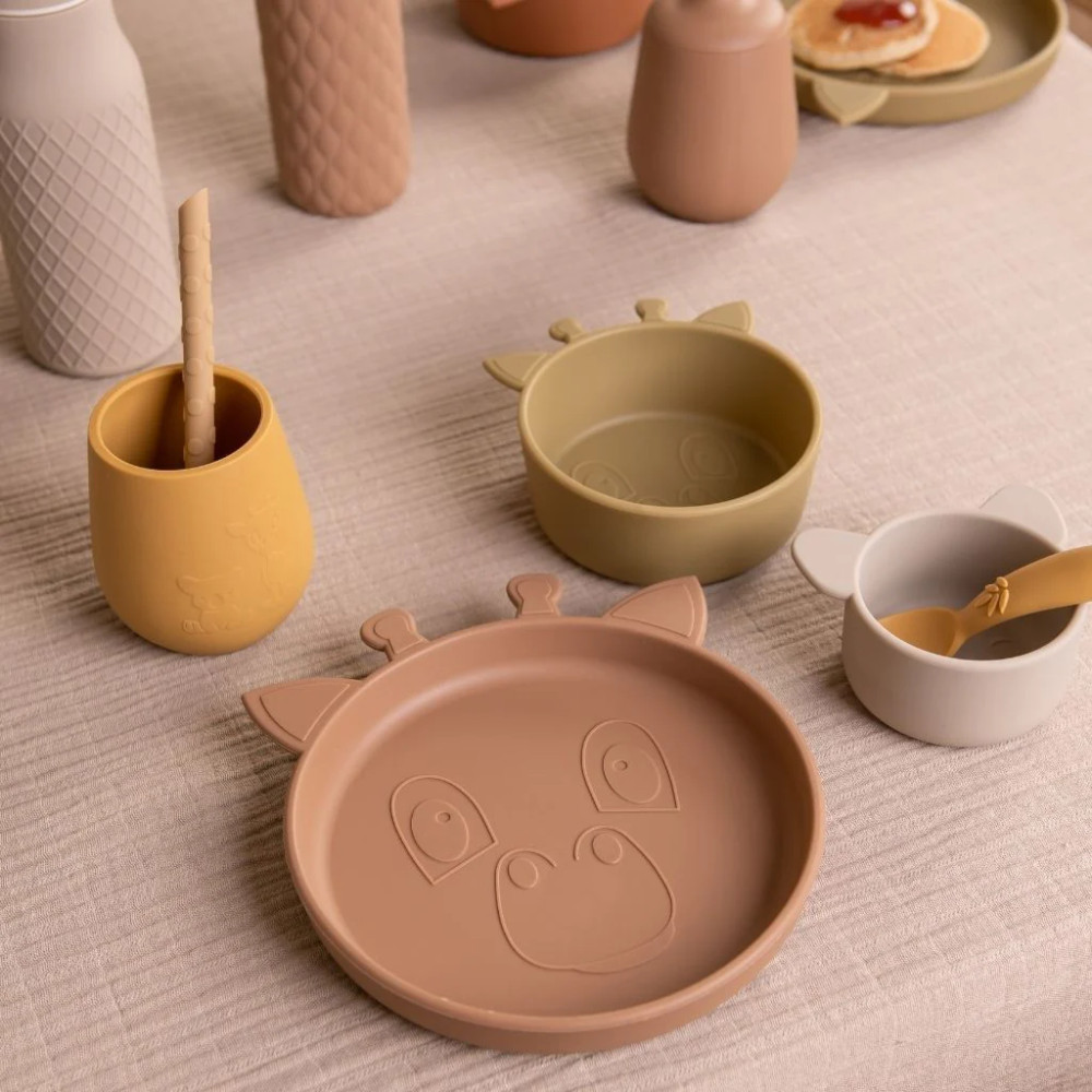 A legjobb étkészlet egy szettben. A 4 darabos készlet tartalmaz egy lapostányért, mélytányért, poharat és kanalat - mindezt egy aranyos zsiráf mintával. Az étkészlet nem tartalmaz kémiailag mérgező anyagokat.  Az anyaga puha szilikon mosogatógépben mosható, és nem törik el, ha gyermeke elejtené.