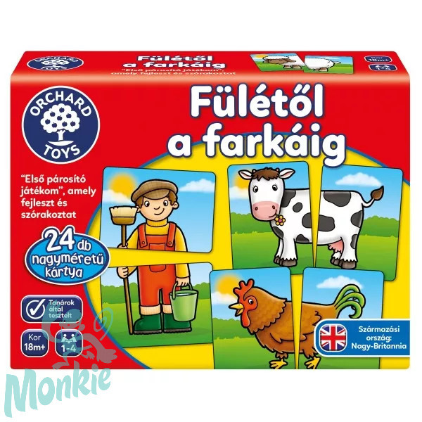 Az Orchard Toys Fülétől a farkáig játéka gondol a kicsikre is. Legyen ez a gyermek első párosító játéka: megkeresi az egymáshoz tartozó két részletet, melyekből egy tanyán, farmon élő állat, vagy egy traktor rakható össze. Az egyszerű párosítás később társasjátékká alakulhat, ahogy nő a gyermek önbizalma és ügyessége. A játék sok területet fejleszt: kézügyesség, megfigyelőképesség, párosítás, kivárás, szociális interakció, beszédkészség, memória.