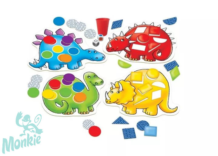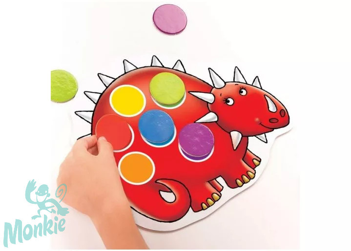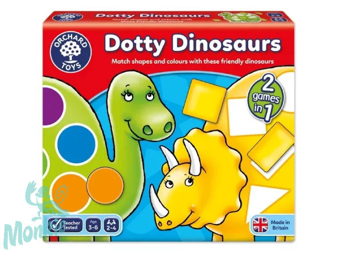 Az Orchard Toys Pöttyös dínók játékában neked kell segíteni megtalálni a dínók elveszett foltjait. A játék kétféleképpen is használható, csak formák vagy csak színek párosítására. Ez a játék kiválóan fejleszti a finommozgást, szín- és forma párosítást, megfigyelőképességet, beszédet, kommunikációt, társas kapcsolatokat.