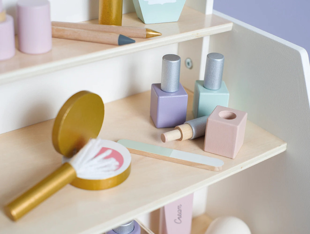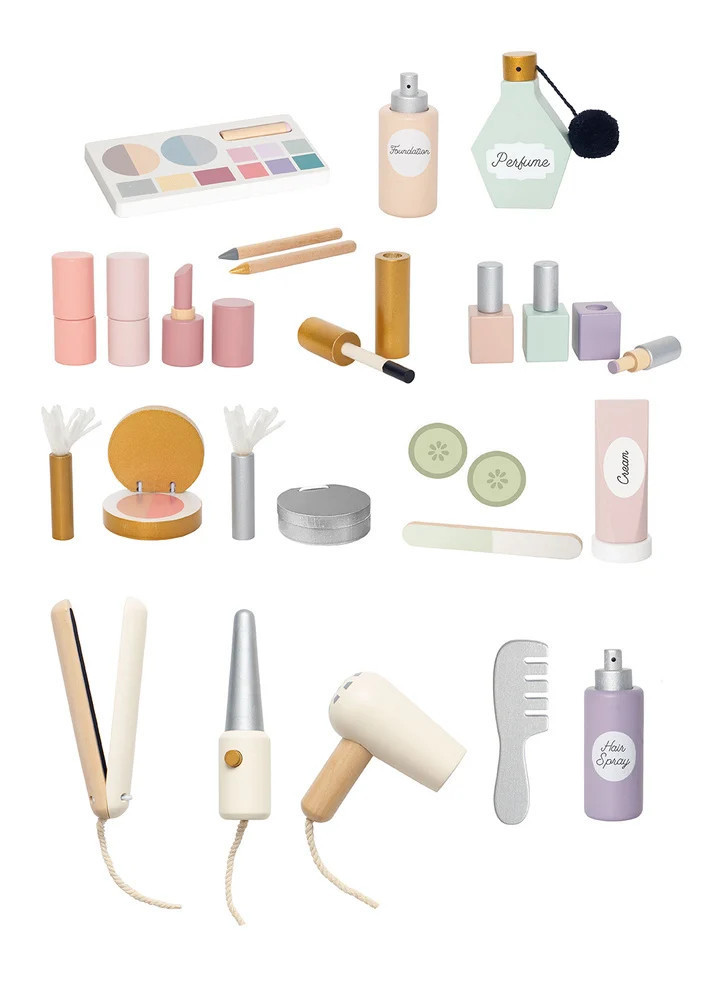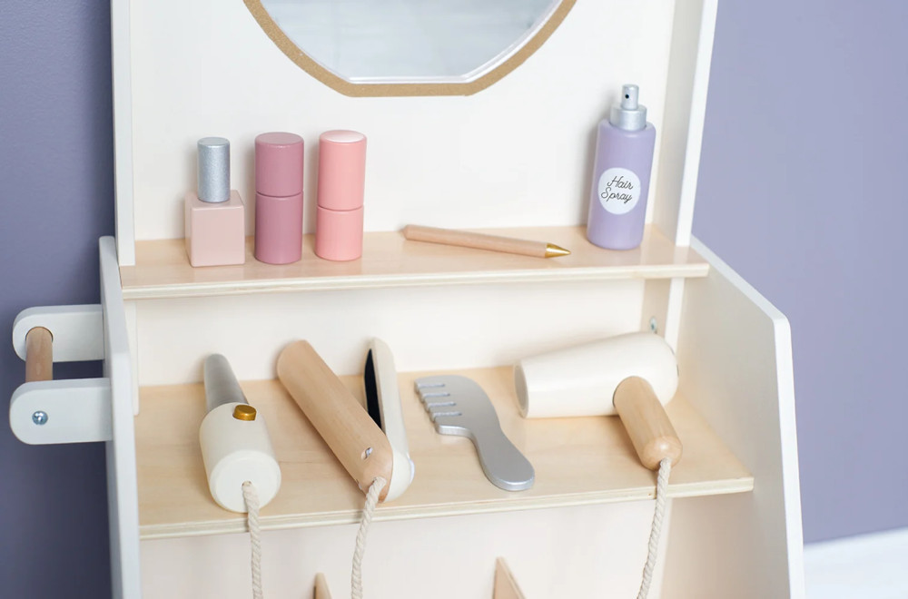 Minden tartozék fából készült a maszatmentes játék érdekében. A szépségszalon kerekekkel és fogantyúkkal rendelkezik, így könnyen mozgatható, a két polcon pedig minden smink- és hajápoló termék tárolható. Összesen 26 különböző luxus tartozékot tartalmaz.