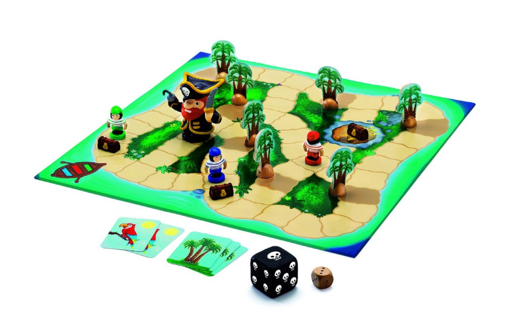 A játék tartalma: 1 db kalózfigura, 3 db hajósinas figura, 3 db kincsesláda, 1 db játéktábla, 7 db kókuszpálma rejtekhely, 1 db nagy kalóz kocka, 1 db kis hajósinaskocka, 9 db kókuszpálmakártya, 4 db papagájkártya.