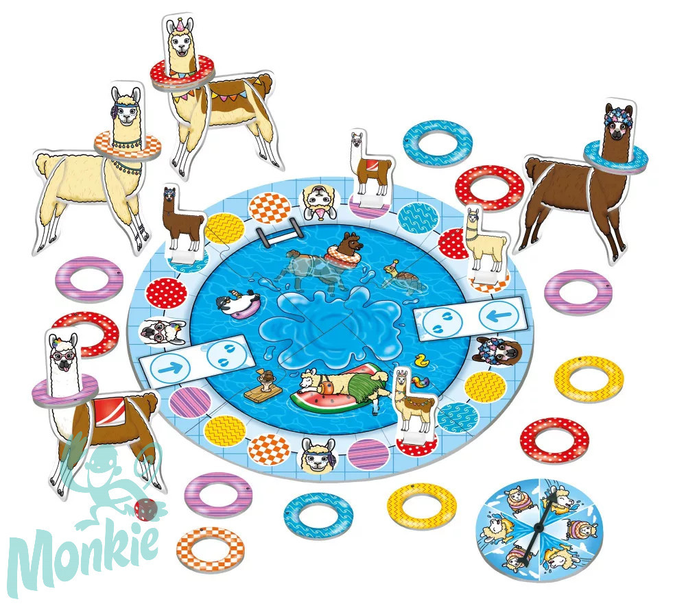 Az Orchard Toys Úszógumis lámák játékában víztől félő lámáknak kell úszógumikat gyűjteni. Az nyer, aki előbb összegyűjti az 5 különböző úszógumit, de ez még nem elég, mert a lámát arra is rá kell venni, hogy bele merjen ugorni a vízbe! Kisebbek számára egyszerűbb játékszabállyal is játszható. A játék kiválóan fejleszti a képzelőerőt, szín- és formapárosítási képességet, szabálykövetési képességet.